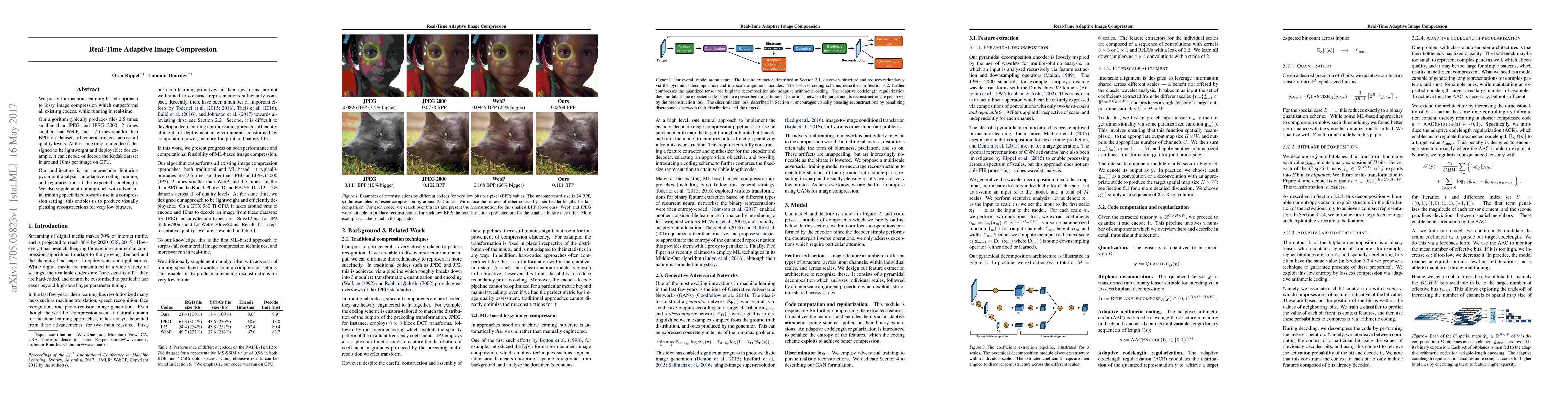 We present a machine learning-based approach to lossy image compression which outperforms all existing codecs, while running in real-time. Our algorithm typically produces files 2.5 times smaller than JPEG and JPEG 2000, 2 times smaller than WebP, and 1.7 times smaller than BPG on datasets of generic images across all quality levels. At the same time, our codec is designed to be lightweight and deployable: for example, it can encode or decode the Kodak dataset in around 10ms per image on GPU. Our architecture is an autoencoder featuring pyramidal analysis, an adaptive coding module, and regularization of the expected codelength. We also supplement our approach with adversarial training specialized towards use in a compression setting: this enables us to produce visually pleasing reconstructions for very low bitrates.