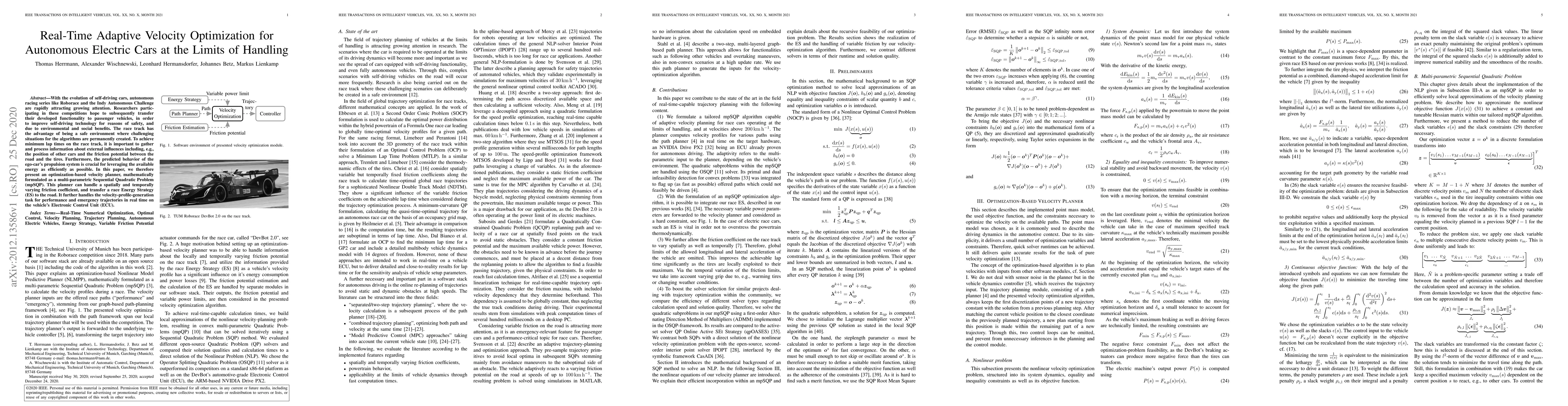 With the evolution of self-driving cars, autonomous racing series like Roborace and the Indy Autonomous Challenge are rapidly attracting growing attention. Researchers participating in these competitions hope to subsequently transfer their developed functionality to passenger vehicles, in order to improve self-driving technology for reasons of safety, and due to environmental and social benefits. The race track has the advantage of being a safe environment where challenging situations for the algorithms are permanently created. To achieve minimum lap times on the race track, it is important to gather and process information about external influences including, e.g., the position of other cars and the friction potential between the road and the tires. Furthermore, the predicted behavior of the ego-car's propulsion system is crucial for leveraging the available energy as efficiently as possible. In this paper, we therefore present an optimization-based velocity planner, mathematically formulated as a multi-parametric Sequential Quadratic Problem (mpSQP). This planner can handle a spatially and temporally varying friction coefficient, and transfer a race Energy Strategy (ES) to the road. It further handles the velocity-profile-generation task for performance and emergency trajectories in real time on the vehicle's Electronic Control Unit (ECU).