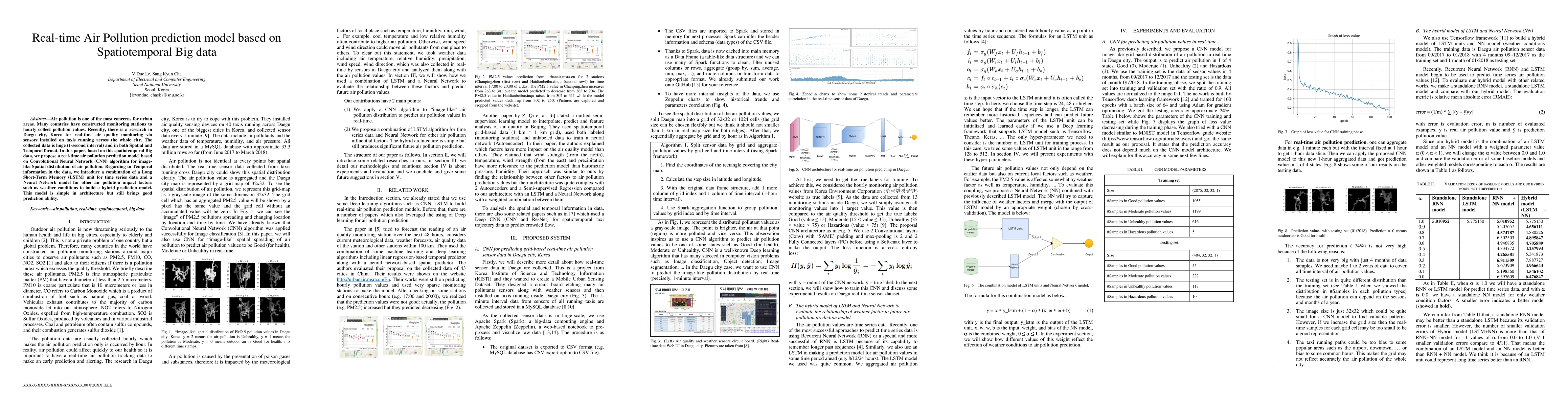 This paper proposes a real-time air pollution prediction model using Convolutional Neural Networks (CNN) for spatial data and a hybrid model combining Long Short-Term Memory (LSTM) units and Neural Networks for temporal data, based on spatiotemporal big data collected from taxi sensors in Daegu city. The model effectively predicts air quality in real-time.