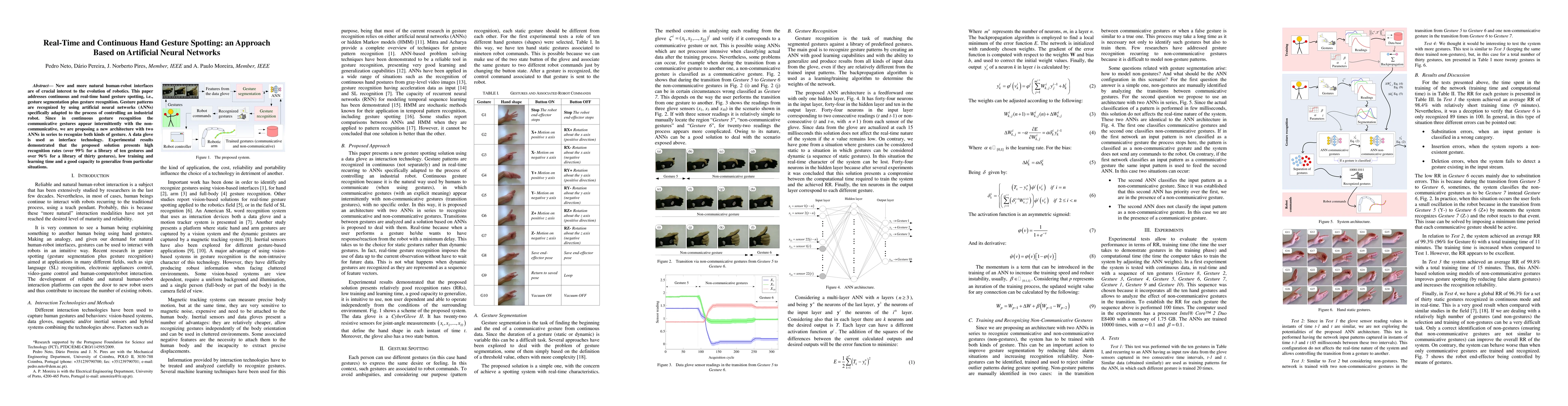 New and more natural human-robot interfaces are of crucial interest to the evolution of robotics. This paper addresses continuous and real-time hand gesture spotting, i.e., gesture segmentation plus gesture recognition. Gesture patterns are recognized by using artificial neural networks (ANNs) specifically adapted to the process of controlling an industrial robot. Since in continuous gesture recognition the communicative gestures appear intermittently with the noncommunicative, we are proposing a new architecture with two ANNs in series to recognize both kinds of gesture. A data glove is used as interface technology. Experimental results demonstrated that the proposed solution presents high recognition rates (over 99% for a library of ten gestures and over 96% for a library of thirty gestures), low training and learning time and a good capacity to generalize from particular situations.