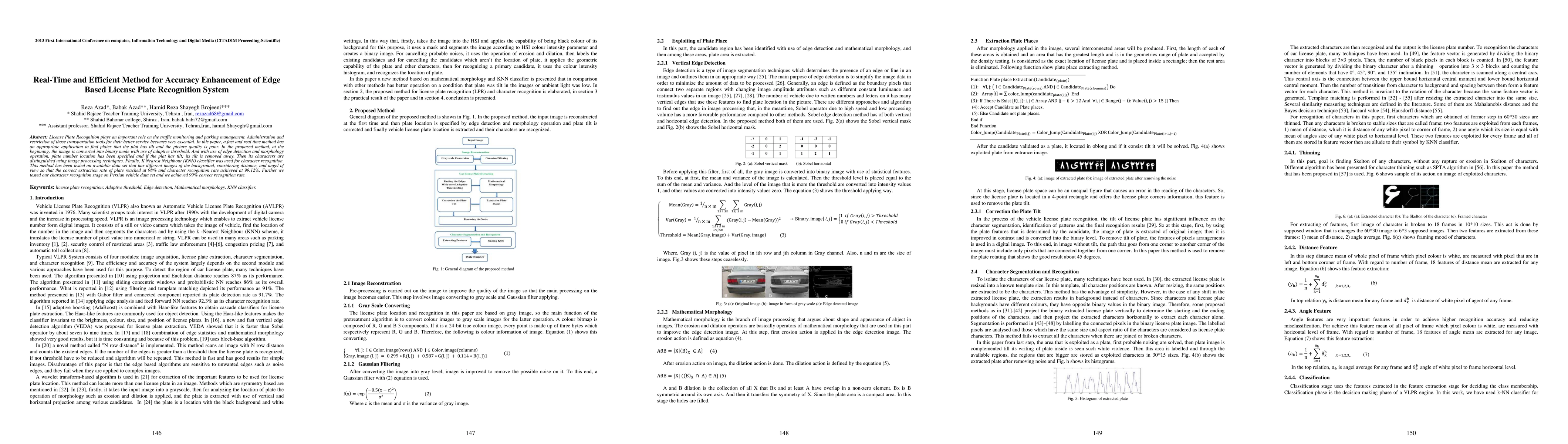 This paper proposes an efficient real-time method for enhancing the accuracy of edge-based license plate recognition, achieving a 98% correct extraction rate and a 99.12% character recognition rate. The method uses adaptive thresholding, edge detection, and morphology to locate and rectify plate tilt, followed by KNN classification for character recognition.