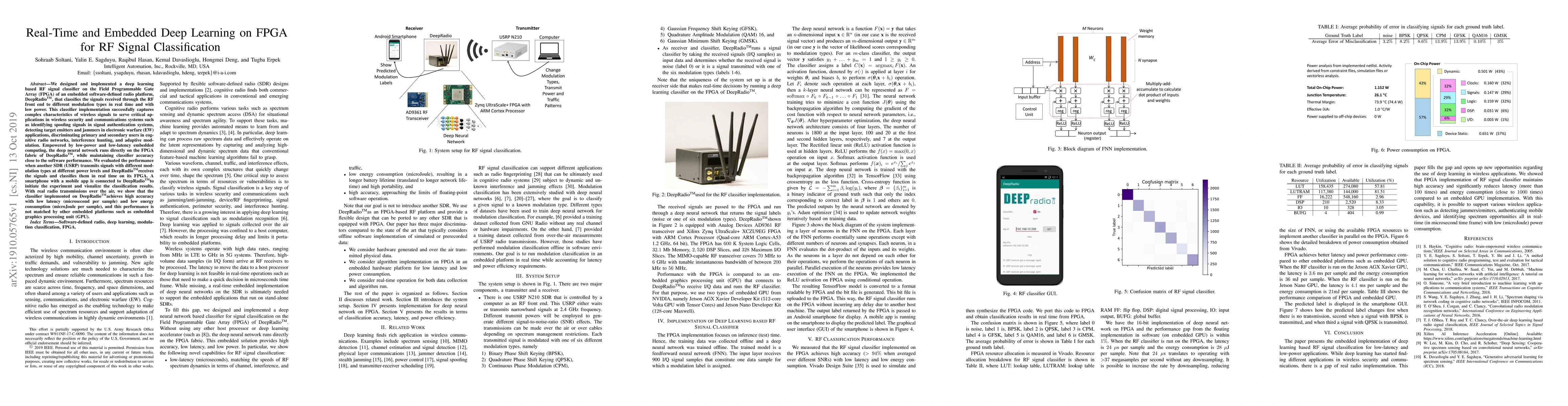 This paper presents a deep learning-based RF signal classifier implemented on an FPGA within an embedded software-defined radio platform, DeepRadio, achieving real-time classification of modulation types with low power and latency. The classifier demonstrates high accuracy and efficiency in applications like signal authentication, electronic warfare, and cognitive radio networks.