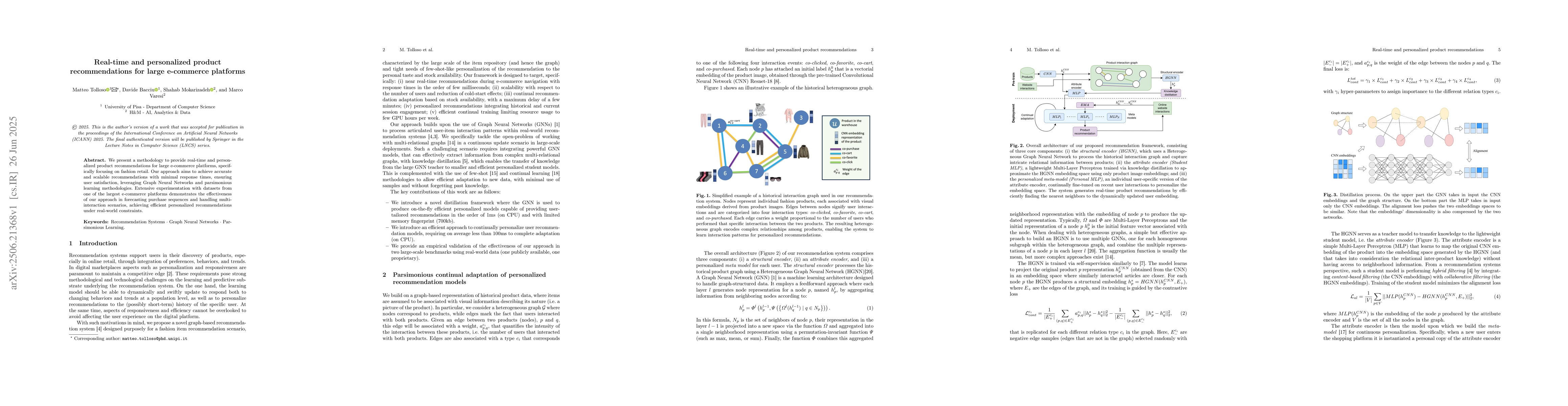 We present a methodology to provide real-time and personalized product recommendations for large e-commerce platforms, specifically focusing on fashion retail. Our approach aims to achieve accurate and scalable recommendations with minimal response times, ensuring user satisfaction, leveraging Graph Neural Networks and parsimonious learning methodologies. Extensive experimentation with datasets from one of the largest e-commerce platforms demonstrates the effectiveness of our approach in forecasting purchase sequences and handling multi-interaction scenarios, achieving efficient personalized recommendations under real-world constraints.