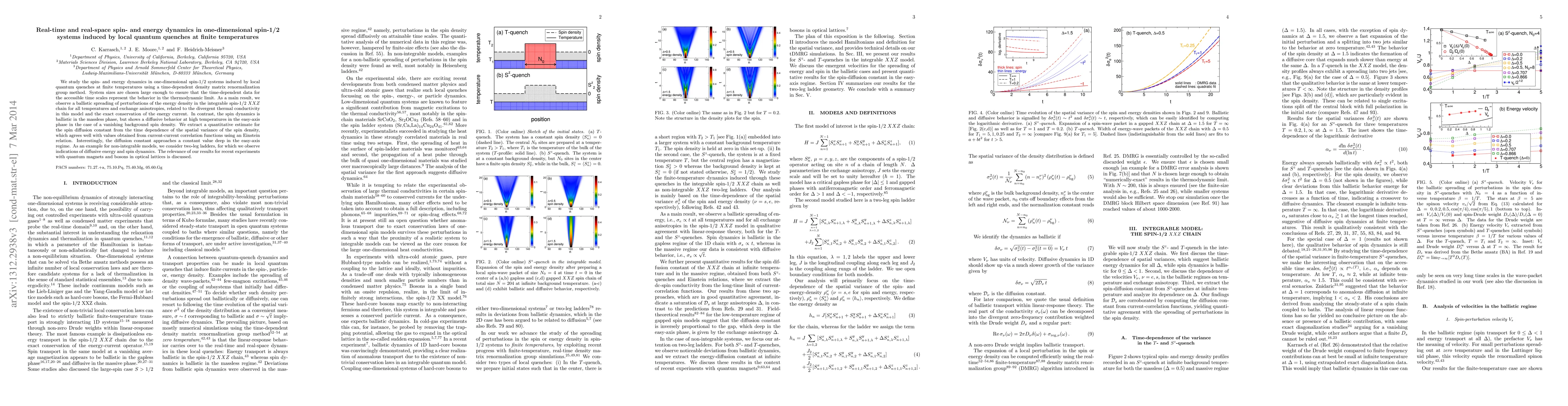 We study the spin- and energy dynamics in one-dimensional spin-1/2 systems induced by local quantum quenches at finite temperatures using a time-dependent density matrix renormalization group method. System sizes are chosen large enough to ensure that the time-dependent data for the accesible time scales represents the behavior in the thermodynamic limit. As a main result, we observe a ballistic spreading of perturbations of the energy density in the integrable spin-1/2 XXZ chain for all temperatures and exchange anisotropies, related to the divergent thermal conductivity in this model and the exact conservation of the energy current. In contrast, the spin dynamics is ballistic in the massless phase, but shows a diffusive behavior at high temperatures in the easy-axis phase in the case of a vanishing background spin density. We extract a quantitative estimate for the spin diffusion constant from the time dependence of the spatial variance of the spin density, which agrees well with values obtained from current-current correlation functions using an Einstein relation. As an example for non-integrable models, we consider two-leg ladders, for which we observe indications of diffusive energy and spin dynamics. The relevance of our results for recent experiments with quantum magnets and bosons in optical lattices is discussed.