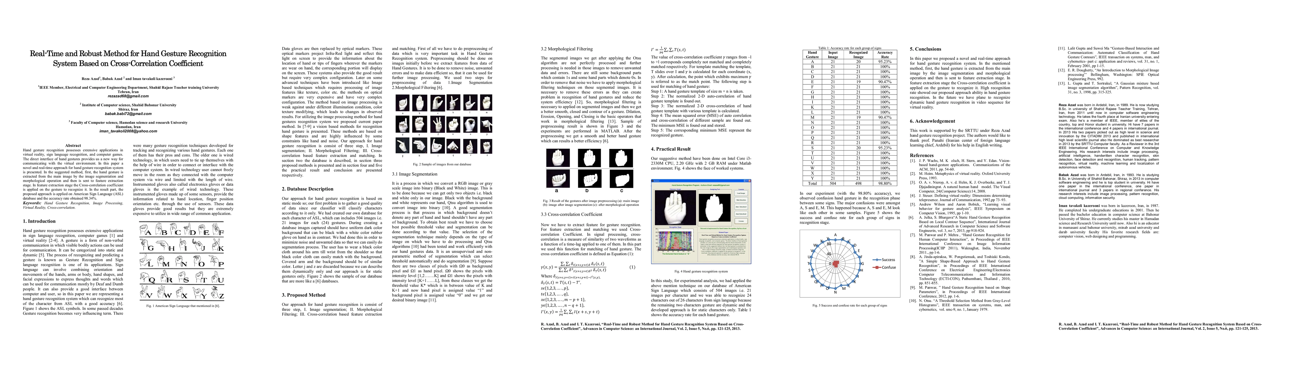 This paper presents a real-time hand gesture recognition system using cross-correlation coefficient for feature extraction. The method segments and processes images to extract gestures, achieving 98.34% accuracy on the American Sign Language database.