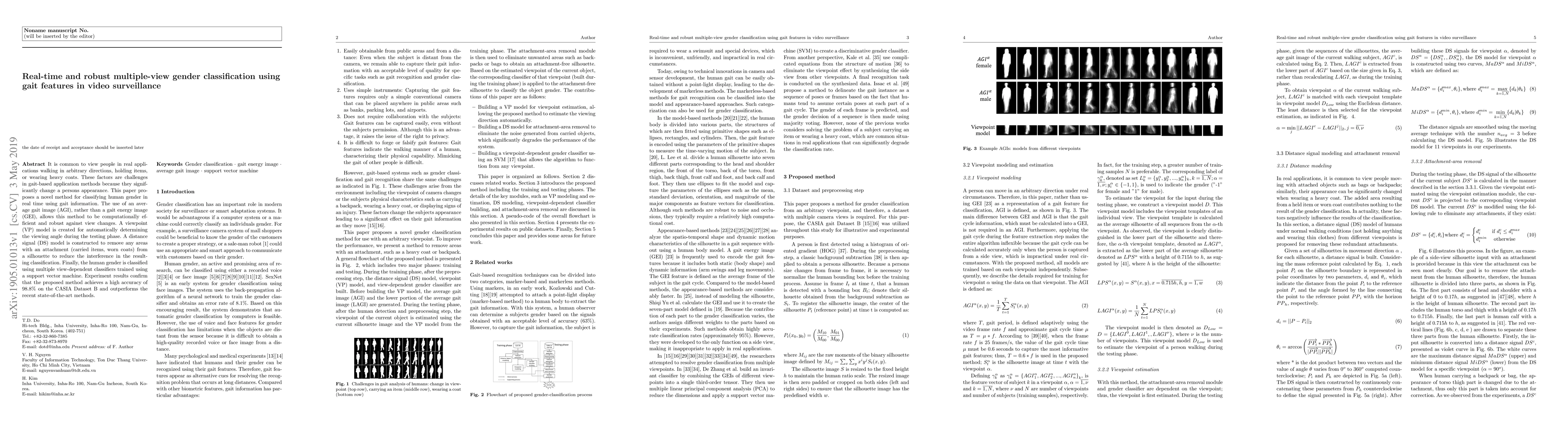 It is common to view people in real applications walking in arbitrary directions, holding items, or wearing heavy coats. These factors are challenges in gait-based application methods because they significantly change a person's appearance. This paper proposes a novel method for classifying human gender in real time using gait information. The use of an average gait image (AGI), rather than a gait energy image (GEI), allows this method to be computationally efficient and robust against view changes. A viewpoint (VP) model is created for automatically determining the viewing angle during the testing phase. A distance signal (DS) model is constructed to remove any areas with an attachment (carried items, worn coats) from a silhouette to reduce the interference in the resulting classification. Finally, the human gender is classified using multiple view-dependent classifiers trained using a support vector machine. Experiment results confirm that the proposed method achieves a high accuracy of 98.8% on the CASIA Dataset B and outperforms the recent state-of-the-art methods.