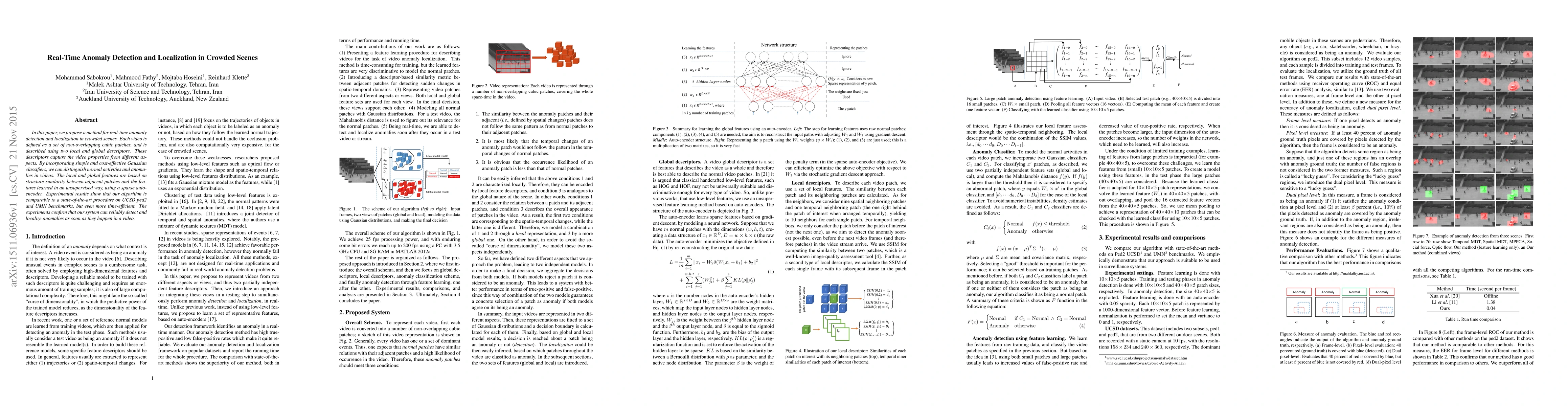 In this paper, we propose a method for real-time anomaly detection and localization in crowded scenes. Each video is defined as a set of non-overlapping cubic patches, and is described using two local and global descriptors. These descriptors capture the video properties from different aspects. By incorporating simple and cost-effective Gaussian classifiers, we can distinguish normal activities and anomalies in videos. The local and global features are based on structure similarity between adjacent patches and the features learned in an unsupervised way, using a sparse auto- encoder. Experimental results show that our algorithm is comparable to a state-of-the-art procedure on UCSD ped2 and UMN benchmarks, but even more time-efficient. The experiments confirm that our system can reliably detect and localize anomalies as soon as they happen in a video.
