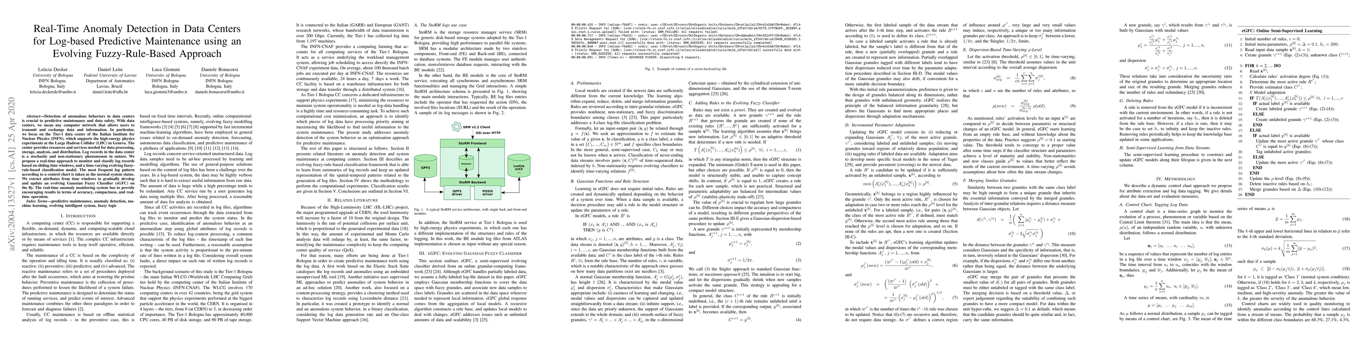 This paper proposes a real-time anomaly detection system for data centers using an evolving fuzzy-rule-based approach to classify log records. The method employs sliding time windows and an evolving Gaussian Fuzzy Classifier (eGFC) to adapt to non-stationary log data, aiming for high accuracy and real-time operation.
