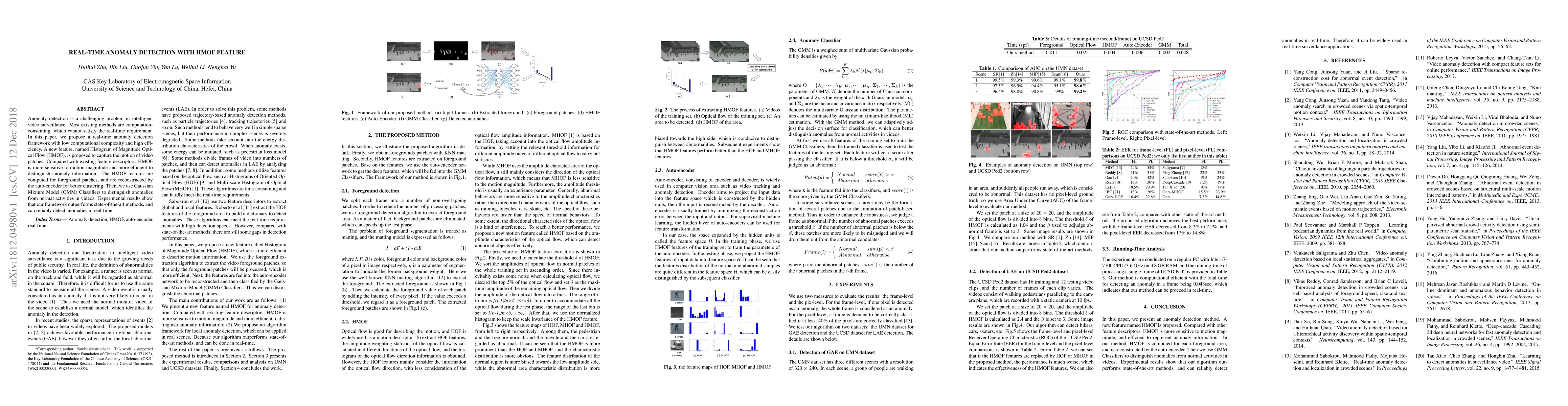 Anomaly detection is a challenging problem in intelligent video surveillance. Most existing methods are computation consuming, which cannot satisfy the real-time requirement. In this paper, we propose a real-time anomaly detection framework with low computational complexity and high efficiency. A new feature, named Histogram of Magnitude Optical Flow (HMOF), is proposed to capture the motion of video patches. Compared with existing feature descriptors, HMOF is more sensitive to motion magnitude and more efficient to distinguish anomaly information. The HMOF features are computed for foreground patches, and are reconstructed by the auto-encoder for better clustering. Then, we use Gaussian Mixture Model (GMM) Classifiers to distinguish anomalies from normal activities in videos. Experimental results show that our framework outperforms state-of-the-art methods, and can reliably detect anomalies in real-time.