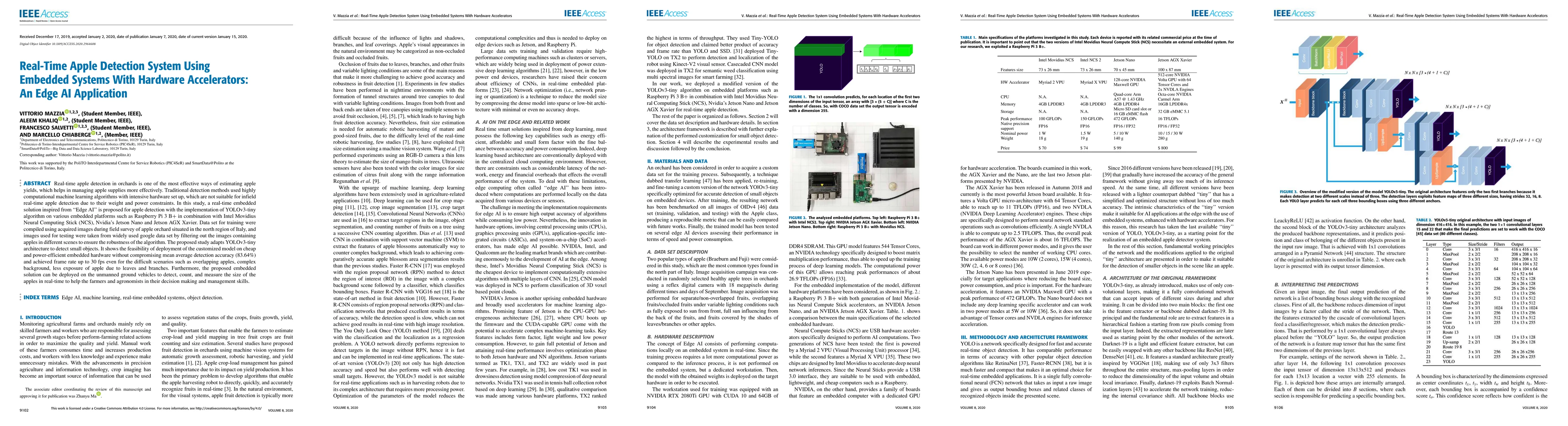 Real-time apple detection in orchards is one of the most effective ways of estimating apple yields, which helps in managing apple supplies more effectively. Traditional detection methods used highly computational machine learning algorithms with intensive hardware set up, which are not suitable for infield real-time apple detection due to their weight and power constraints. In this study, a real-time embedded solution inspired from "Edge AI" is proposed for apple detection with the implementation of YOLOv3-tiny algorithm on various embedded platforms such as Raspberry Pi 3 B+ in combination with Intel Movidius Neural Computing Stick (NCS), Nvidia's Jetson Nano and Jetson AGX Xavier. Data set for training were compiled using acquired images during field survey of apple orchard situated in the north region of Italy, and images used for testing were taken from widely used google data set by filtering out the images containing apples in different scenes to ensure the robustness of the algorithm. The proposed study adapts YOLOv3-tiny architecture to detect small objects. It shows the feasibility of deployment of the customized model on cheap and power-efficient embedded hardware without compromising mean average detection accuracy (83.64%) and achieved frame rate up to 30 fps even for the difficult scenarios such as overlapping apples, complex background, less exposure of apple due to leaves and branches. Furthermore, the proposed embedded solution can be deployed on the unmanned ground vehicles to detect, count, and measure the size of the apples in real-time to help the farmers and agronomists in their decision making and management skills.
