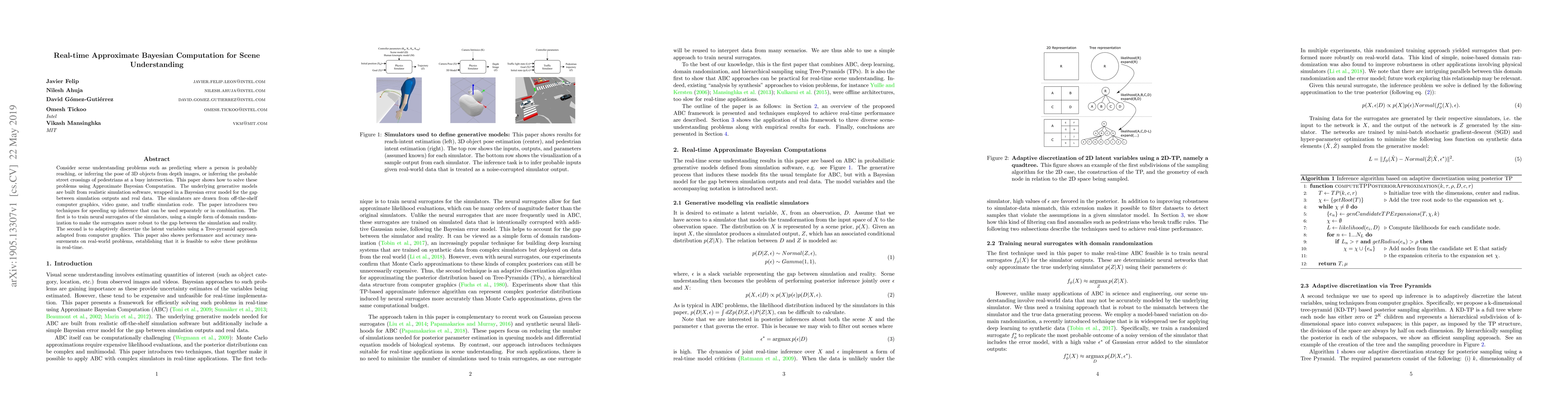 Consider scene understanding problems such as predicting where a person is probably reaching, or inferring the pose of 3D objects from depth images, or inferring the probable street crossings of pedestrians at a busy intersection. This paper shows how to solve these problems using Approximate Bayesian Computation. The underlying generative models are built from realistic simulation software, wrapped in a Bayesian error model for the gap between simulation outputs and real data. The simulators are drawn from off-the-shelf computer graphics, video game, and traffic simulation code. The paper introduces two techniques for speeding up inference that can be used separately or in combination. The first is to train neural surrogates of the simulators, using a simple form of domain randomization to make the surrogates more robust to the gap between the simulation and reality. The second is to adaptively discretize the latent variables using a Tree-pyramid approach adapted from computer graphics. This paper also shows performance and accuracy measurements on real-world problems, establishing that it is feasible to solve these problems in real-time.