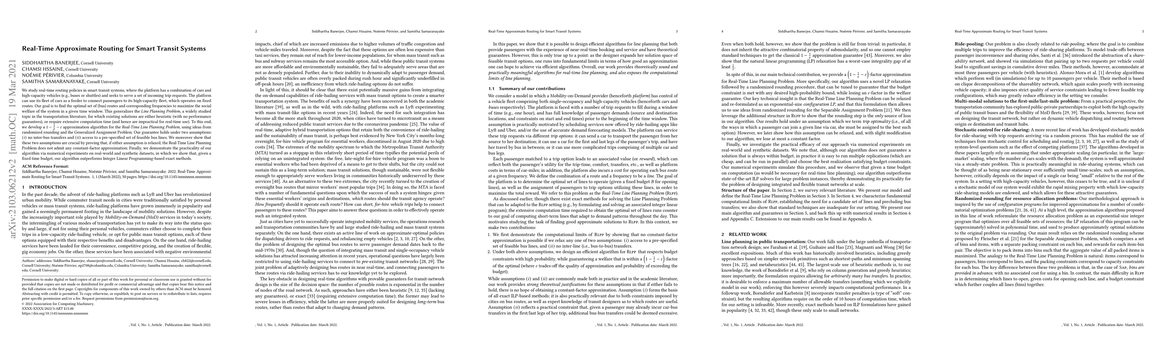 We study real-time routing policies in smart transit systems, where the platform has a combination of cars and high-capacity vehicles (e.g., buses or shuttles) and seeks to serve a set of incoming trip requests. The platform can use its fleet of cars as a feeder to connect passengers to its high-capacity fleet, which operates on fixed routes. Our goal is to find the optimal set of (bus) routes and corresponding frequencies to maximize the social welfare of the system in a given time window. This generalizes the Line Planning Problem, a widely studied topic in the transportation literature, for which existing solutions are either heuristic (with no performance guarantees), or require extensive computation time (and hence are impractical for real-time use). To this end, we develop a $1-\frac{1}{e}-\varepsilon$ approximation algorithm for the Real-Time Line Planning Problem, using ideas from randomized rounding and the Generalized Assignment Problem. Our guarantee holds under two assumptions: $(i)$ no inter-bus transfers and $(ii)$ access to a pre-specified set of feasible bus lines. We moreover show that these two assumptions are crucial by proving that, if either assumption is relaxed, the Real-Time Line Planning Problem does not admit any constant-factor approximation. Finally, we demonstrate the practicality of our algorithm via numerical experiments on real-world and synthetic datasets, in which we show that, given a fixed time budget, our algorithm outperforms Integer Linear Programming-based exact methods.