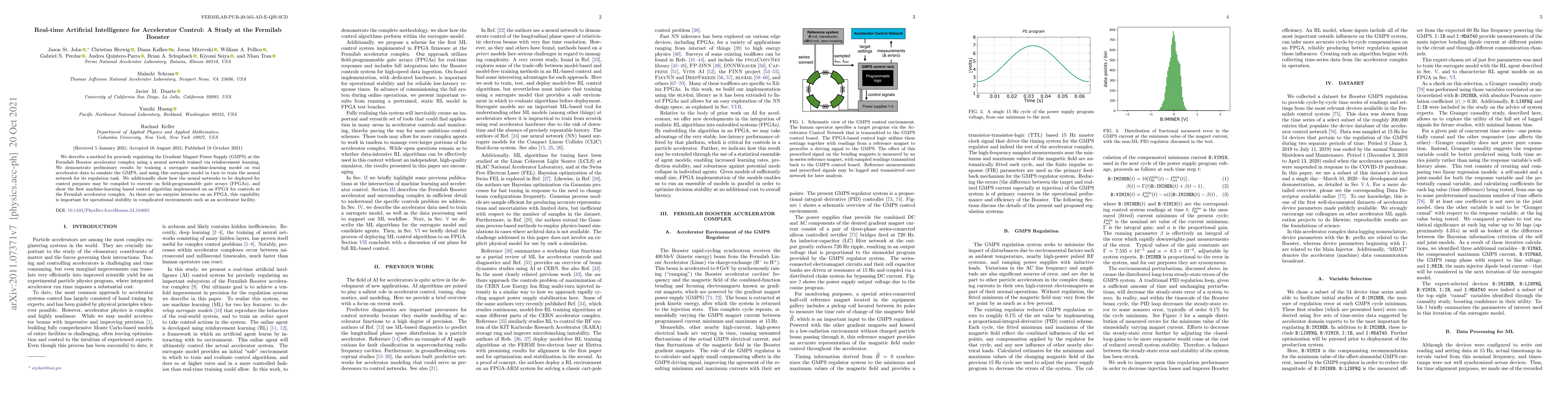 We describe a method for precisely regulating the gradient magnet power supply at the Fermilab Booster accelerator complex using a neural network trained via reinforcement learning. We demonstrate preliminary results by training a surrogate machine-learning model on real accelerator data to emulate the Booster environment, and using this surrogate model in turn to train the neural network for its regulation task. We additionally show how the neural networks to be deployed for control purposes may be compiled to execute on field-programmable gate arrays. This capability is important for operational stability in complicated environments such as an accelerator facility.