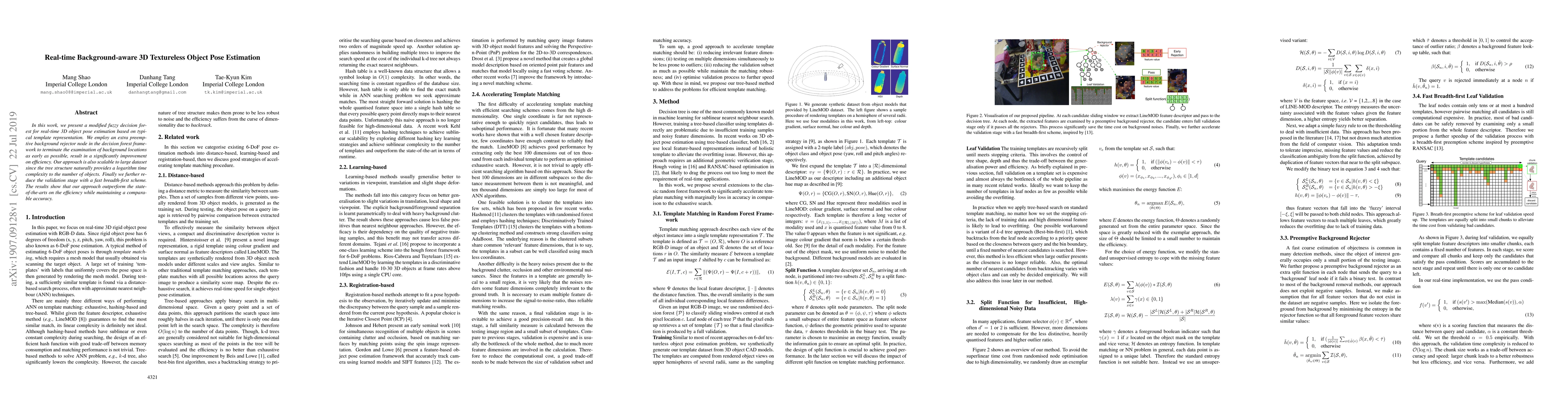 In this work, we present a modified fuzzy decision forest for real-time 3D object pose estimation based on typical template representation. We employ an extra preemptive background rejector node in the decision forest framework to terminate the examination of background locations as early as possible, result in a significantly improvement on efficiency. Our approach is also scalable to large dataset since the tree structure naturally provides a logarithm time complexity to the number of objects. Finally we further reduce the validation stage with a fast breadth-first scheme. The results show that our approach outperform the state-of-the-arts on the efficiency while maintaining a comparable accuracy.