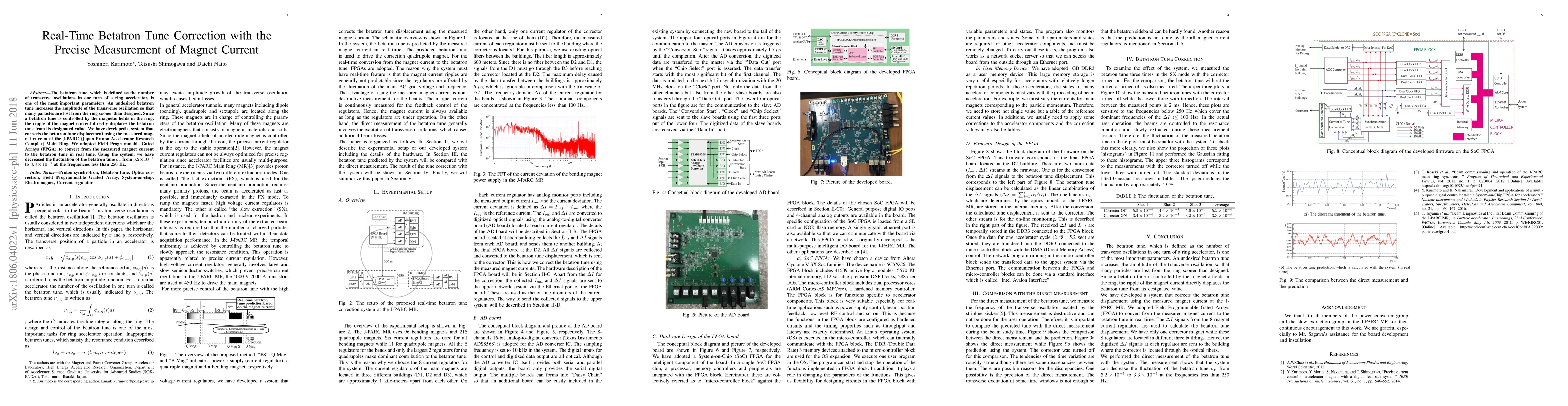 This paper presents a system for real-time correction of betatron tune displacement in a ring accelerator by precisely measuring magnet current. Using FPGAs, the system effectively reduces betatron tune fluctuations from 5.2e-4 to 3.3e-4 at frequencies below 250 Hz.