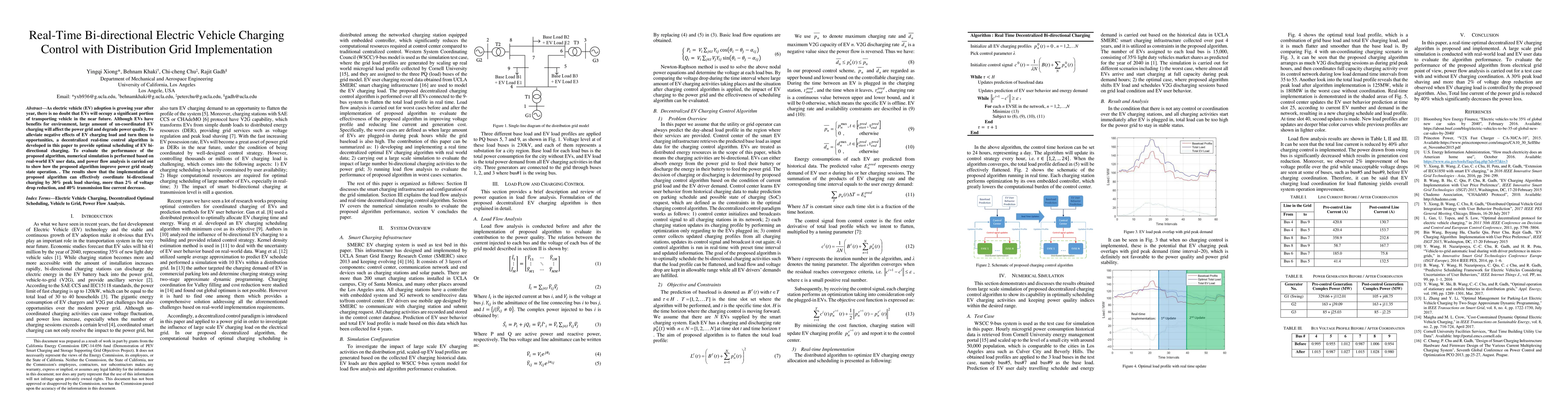 As electric vehicle (EV) adoption is growing year after year, there is no doubt that EVs will occupy a significant portion of transporting vehicle in the near future. Although EVs have benefits for environment, large amount of un-coordinated EV charging will affect the power grid and degrade power quality. To alleviate negative effects of EV charging load and turn them to opportunities, a decentralized real-time control algorithm is developed in this paper to provide optimal scheduling of EV bi-directional charging. To evaluate the performance of the proposed algorithm, numerical simulation is performed based on real-world EV user data, and power flow analysis is carried out to show how the proposed algorithm improve power grid steady state operation. . The results show that the implementation of proposed algorithm can effectively coordinate bi-directional charging by 30% peak load shaving, more than 2% of voltage drop reduction, and 40% transmission line current decrease.