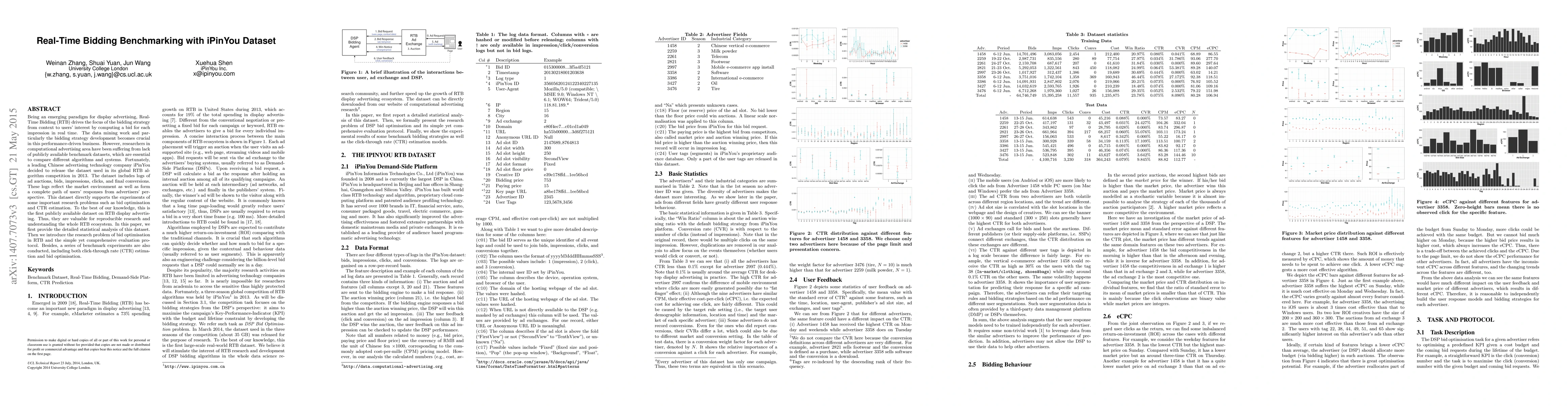 Being an emerging paradigm for display advertising, Real-Time Bidding (RTB) drives the focus of the bidding strategy from context to users' interest by computing a bid for each impression in real time. The data mining work and particularly the bidding strategy development becomes crucial in this performance-driven business. However, researchers in computational advertising area have been suffering from lack of publicly available benchmark datasets, which are essential to compare different algorithms and systems. Fortunately, a leading Chinese advertising technology company iPinYou decided to release the dataset used in its global RTB algorithm competition in 2013. The dataset includes logs of ad auctions, bids, impressions, clicks, and final conversions. These logs reflect the market environment as well as form a complete path of users' responses from advertisers' perspective. This dataset directly supports the experiments of some important research problems such as bid optimisation and CTR estimation. To the best of our knowledge, this is the first publicly available dataset on RTB display advertising. Thus, they are valuable for reproducible research and understanding the whole RTB ecosystem. In this paper, we first provide the detailed statistical analysis of this dataset. Then we introduce the research problem of bid optimisation in RTB and the simple yet comprehensive evaluation protocol. Besides, a series of benchmark experiments are also conducted, including both click-through rate (CTR) estimation and bid optimisation.