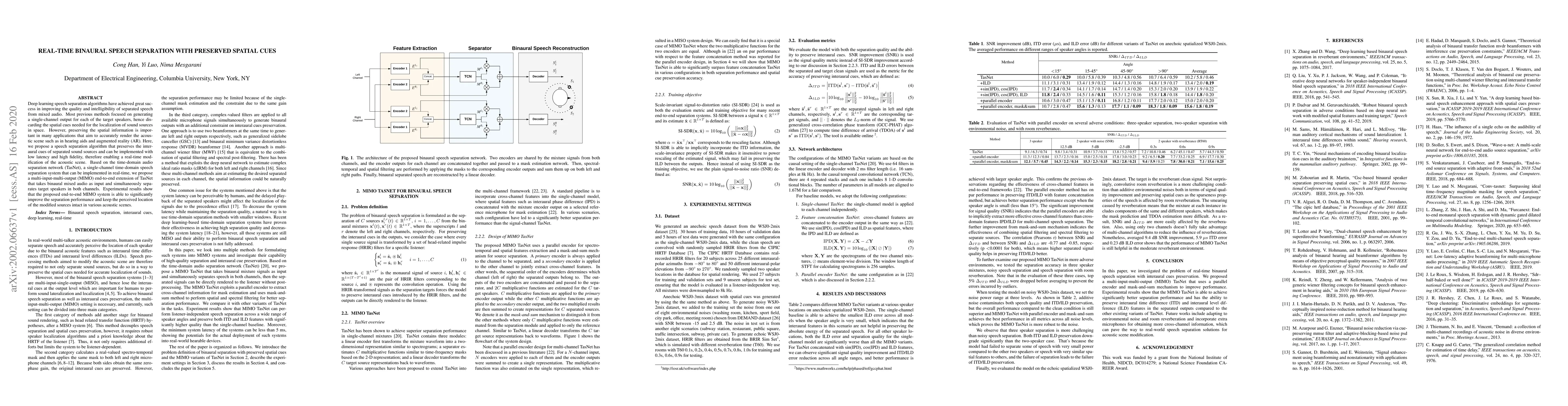 This paper proposes a real-time binaural speech separation algorithm that preserves spatial cues, crucial for applications like hearing aids and augmented reality. The method extends the TasNet model to a multi-input-multi-output system, achieving high fidelity and low latency while maintaining the spatial integrity of separated sound sources.