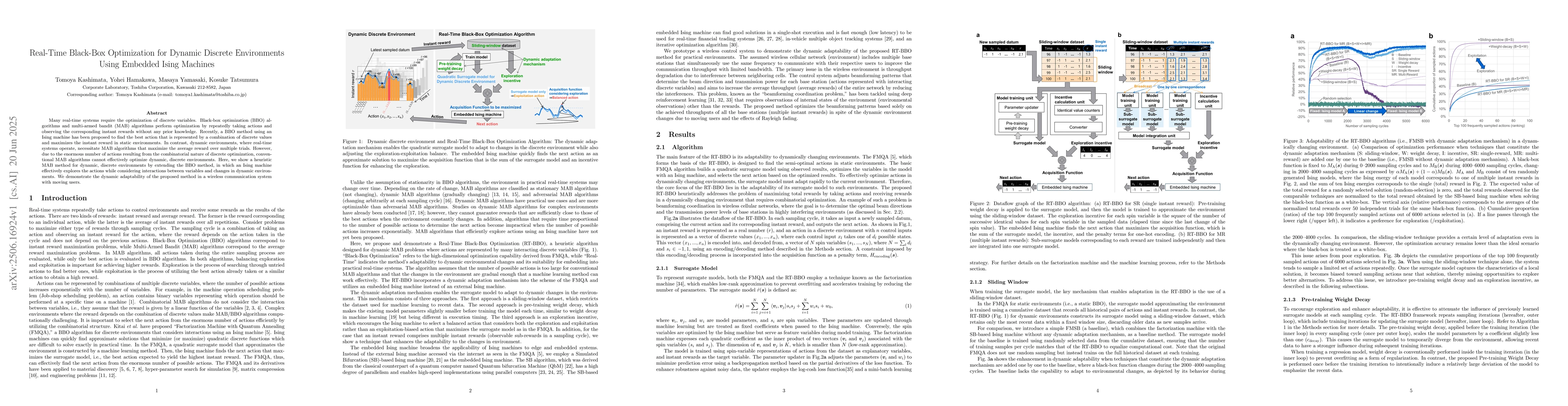 Many real-time systems require the optimization of discrete variables. Black-box optimization (BBO) algorithms and multi-armed bandit (MAB) algorithms perform optimization by repeatedly taking actions and observing the corresponding instant rewards without any prior knowledge. Recently, a BBO method using an Ising machine has been proposed to find the best action that is represented by a combination of discrete values and maximizes the instant reward in static environments. In contrast, dynamic environments, where real-time systems operate, necessitate MAB algorithms that maximize the average reward over multiple trials. However, due to the enormous number of actions resulting from the combinatorial nature of discrete optimization, conventional MAB algorithms cannot effectively optimize dynamic, discrete environments. Here, we show a heuristic MAB method for dynamic, discrete environments by extending the BBO method, in which an Ising machine effectively explores the actions while considering interactions between variables and changes in dynamic environments. We demonstrate the dynamic adaptability of the proposed method in a wireless communication system with moving users.