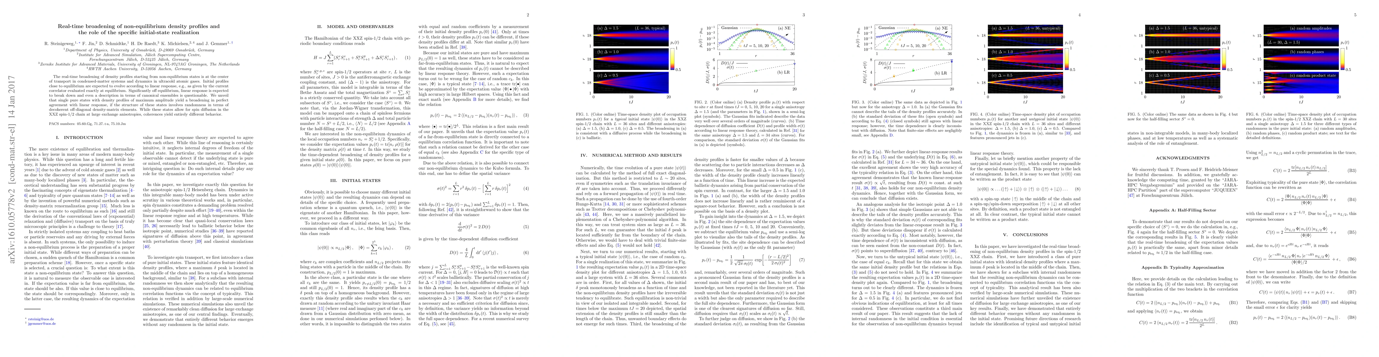 The real-time broadening of density profiles starting from non-equilibrium states is at the center of transport in condensed-matter systems and dynamics in ultracold atomic gases. Initial profiles close to equilibrium are expected to evolve according to linear response, e.g., as given by the current correlator evaluated exactly at equilibrium. Significantly off equilibrium, linear response is expected to break down and even a description in terms of canonical ensembles is questionable. We unveil that single pure states with density profiles of maximum amplitude yield a broadening in perfect agreement with linear response, if the structure of these states involves randomness in terms of decoherent off-diagonal density-matrix elements. While these states allow for spin diffusion in the XXZ spin-1/2 chain at large exchange anisotropies, coherences yield entirely different behavior.