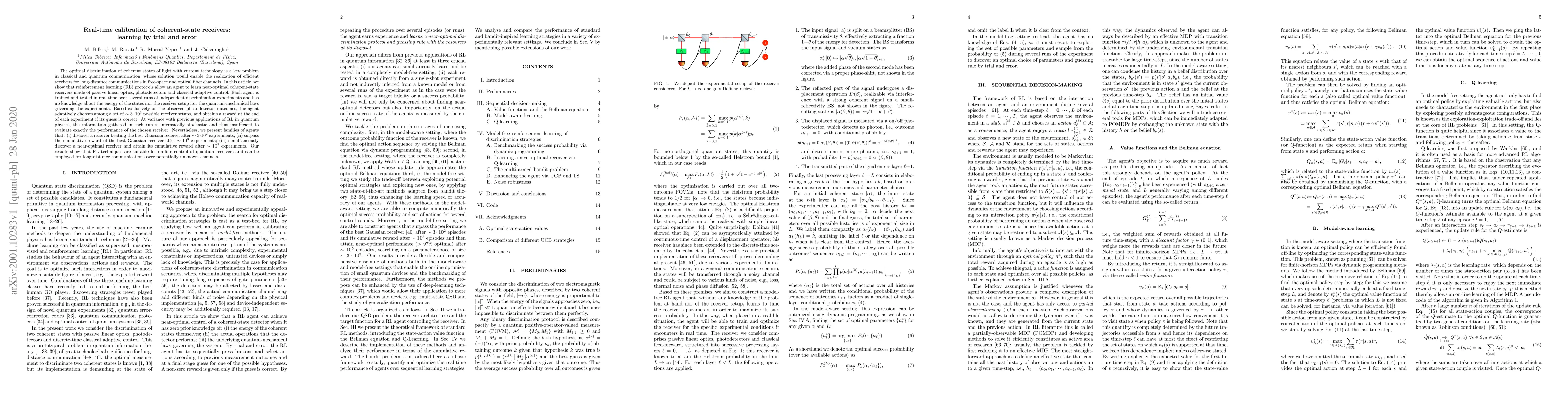 The optimal discrimination of coherent states of light with current technology is a key problem in classical and quantum communication, whose solution would enable the realization of efficient receivers for long-distance communications in free-space and optical fiber channels. In this article, we show that reinforcement learning (RL) protocols allow an agent to learn near-optimal coherent-state receivers made of passive linear optics, photodetectors and classical adaptive control. Each agent is trained and tested in real time over several runs of independent discrimination experiments and has no knowledge about the energy of the states nor the receiver setup nor the quantum-mechanical laws governing the experiments. Based exclusively on the observed photodetector outcomes, the agent adaptively chooses among a set of ~3 10^3 possible receiver setups, and obtains a reward at the end of each experiment if its guess is correct. At variance with previous applications of RL in quantum physics, the information gathered in each run is intrinsically stochastic and thus insufficient to evaluate exactly the performance of the chosen receiver. Nevertheless, we present families of agents that: (i) discover a receiver beating the best Gaussian receiver after ~3 10^2 experiments; (ii) surpass the cumulative reward of the best Gaussian receiver after ~10^3 experiments; (iii) simultaneously discover a near-optimal receiver and attain its cumulative reward after ~10^5 experiments. Our results show that RL techniques are suitable for on-line control of quantum receivers and can be employed for long-distance communications over potentially unknown channels.