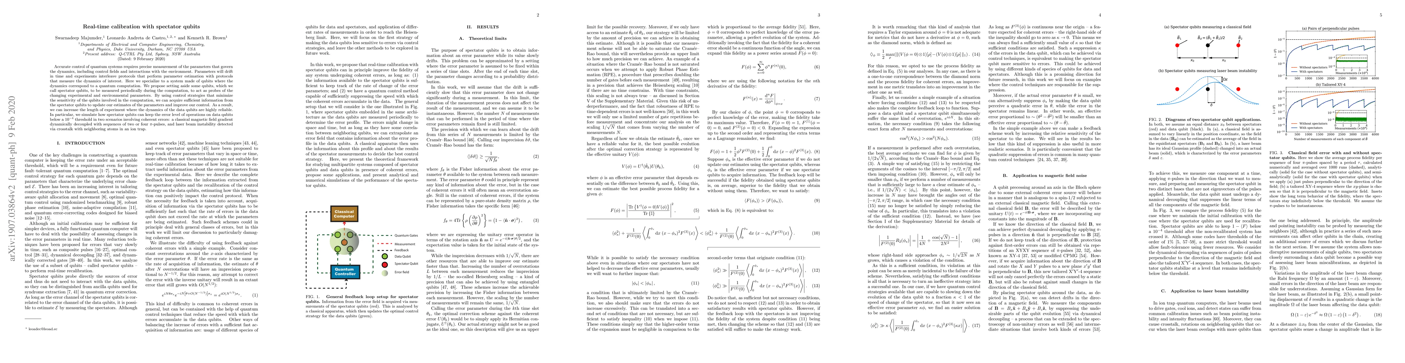 Accurate control of quantum systems requires precise measurement of the parameters that govern the dynamics, including control fields and interactions with the environment. Parameters will drift in time and experiments interleave protocols that perform parameter estimation with protocols that measure the dynamics of interest. Here we specialize to a system made of qubits where the dynamics correspond to a quantum computation. We propose setting aside some qubits, which we call spectator qubits, to be measured periodically during the computation, to act as probes of the changing experimental and environmental parameters. By using control strategies that minimize the sensitivity of the qubits involved in the computation, we can acquire sufficient information from the spectator qubits to update our estimates of the parameters and improve our control. As a result, we can increase the length of experiment where the dynamics of the data qubits are highly reliable. In particular, we simulate how spectator qubits can keep the error level of operations on data qubits below a $10^{-4}$ threshold in two scenarios involving coherent errors: a classical magnetic field gradient dynamically decoupled with sequences of two or four $\pi$-pulses, and laser beam instability detected via crosstalk with neighboring atoms in an ion trap.