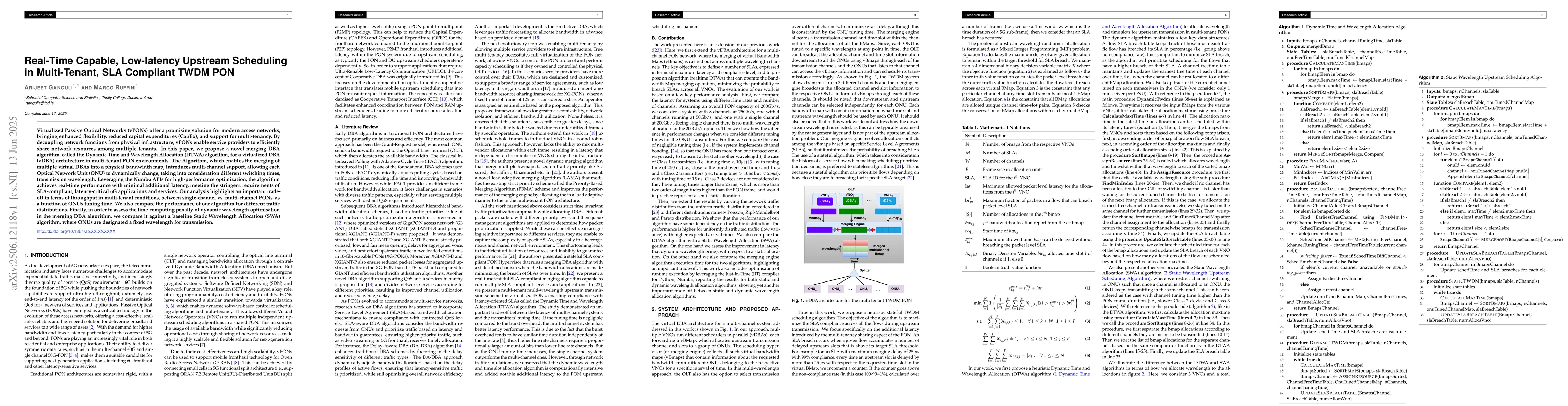 Virtualized Passive Optical Networks (vPONs) offer a promising solution for modern access networks, bringing enhanced flexibility, reduced capital expenditures (CapEx), and support for multi-tenancy. By decoupling network functions from physical infrastructure, vPONs enable service providers to efficiently share network resources among multiple tenants. In this paper, we propose a novel merging DBA algorithm, called the Dynamic Time and Wavelength Allocation (DTWA) algorithm, for a virtualized DBA (vDBA) architecture in multi-tenant PON environments. The Algorithm, which enables the merging of multiple virtual DBAs into a physical bandwidth map, introduces multi-channel support, allowing each Optical Network Unit (ONU) to dynamically change, taking into consideration different switching times, transmission wavelength. Leveraging the Numba APIs for high-performance optimization, the algorithm achieves real-time performance with minimal additional latency, meeting the stringent requirements of SLA-compliant, latency-critical 6G applications and services. Our analysis highlights an important trade-off in terms of throughput in multi-tenant conditions, between single-channel vs. multi-channel PONs, as a function of ONUs tuning time. We also compare the performance of our algorithm for different traffic distributions. Finally, in order to assess the time computing penalty of dynamic wavelength optimisation in the merging DBA algorithm, we compare it against a baseline Static Wavelength Allocation (SWA) algorithm, where ONUs are designated a fixed wavelength for transmission.