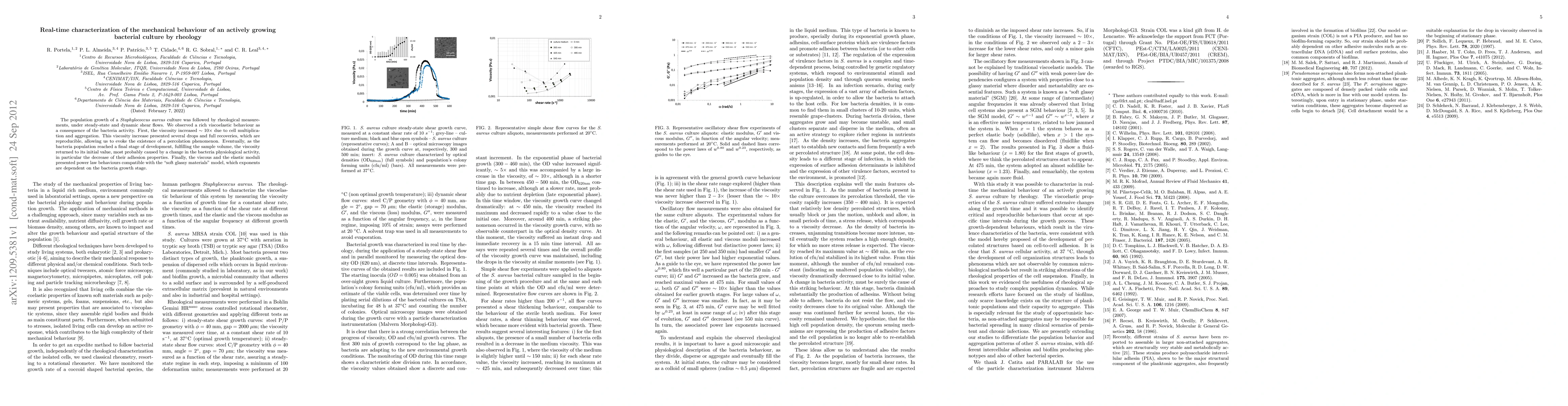 The population growth of a Staphylococcus aureus culture was followed by rheological measurements, under steady-state and dynamic shear flows. We observed a rich viscoelastic behaviour as a consequence of the bacteria activity. First, the viscosity increased ~10 times due to cell multiplication and aggregation. This viscosity increase presented several drops and full recoveries, which are reproducible, allowing us to evoke the existence of a percolation phenomenon. Eventually, as the bacteria population reached a final stage of development, fulfilling the sample volume, the viscosity returned to its initial value, most probably caused by a change in the bacteria physiological activity, in particular the decrease of their adhesion properties. Finally, the viscous and the elastic moduli presented power law behaviours compatible with the "soft glassy materials" model, which exponents are dependent on the bacteria growth stage.