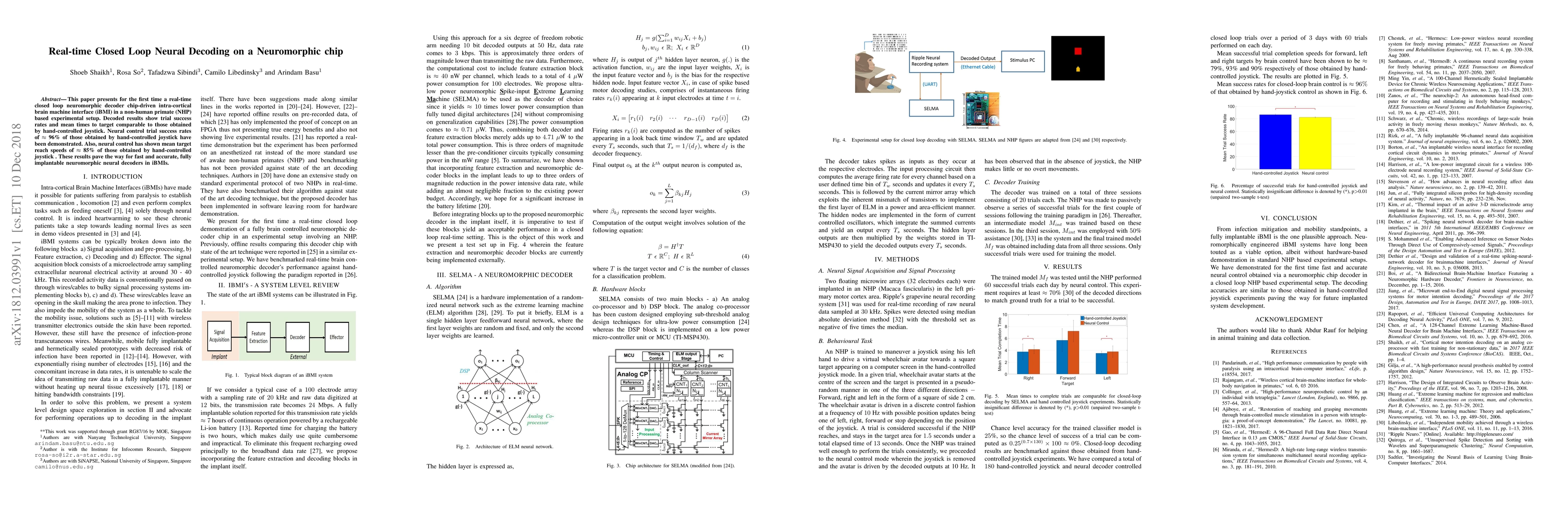 This paper introduces a real-time neuromorphic decoder chip for an intra-cortical brain machine interface in non-human primates, achieving 96% trial success rates and 85% target reach speeds compared to hand-controlled joysticks. These results indicate the potential for fast and accurate fully implantable neuromorphic neural decoders.
