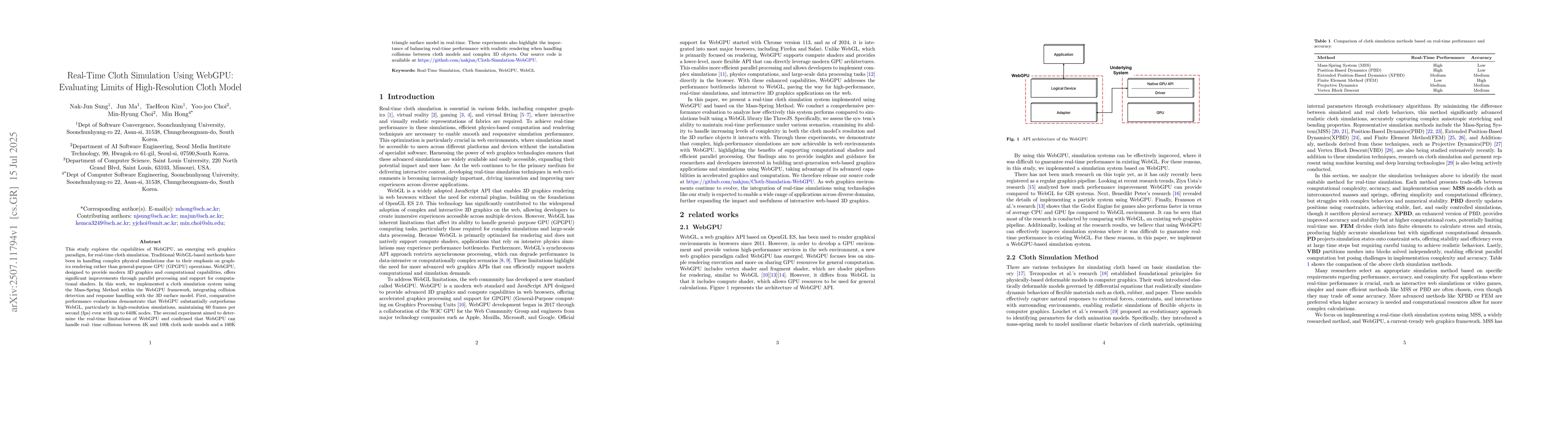 This study explores the capabilities of WebGPU, an emerging web graphics paradigm, for real-time cloth simulation. Traditional WebGL-based methods have been in handling complex physical simulations due to their emphasis on graphics rendering rather than general-purpose GPU (GPGPU) operations. WebGPU, designed to provide modern 3D graphics and computational capabilities, offers significant improvements through parallel processing and support for computational shaders. In this work, we implemented a cloth simulation system using the Mass-Spring Method within the WebGPU framework, integrating collision detection and response handling with the 3D surface model. First, comparative performance evaluations demonstrate that WebGPU substantially outperforms WebGL, particularly in high-resolution simulations, maintaining 60 frames per second (fps) even with up to 640K nodes. The second experiment aimed to determine the real-time limitations of WebGPU and confirmed that WebGPU can handle real-time collisions between 4K and 100k cloth node models and a 100K triangle surface model in real-time. These experiments also highlight the importance of balancing real-time performance with realistic rendering when handling collisions between cloth models and complex 3D objects. Our source code is available at https://github.com/nakjun/Cloth-Simulation-WebGPU