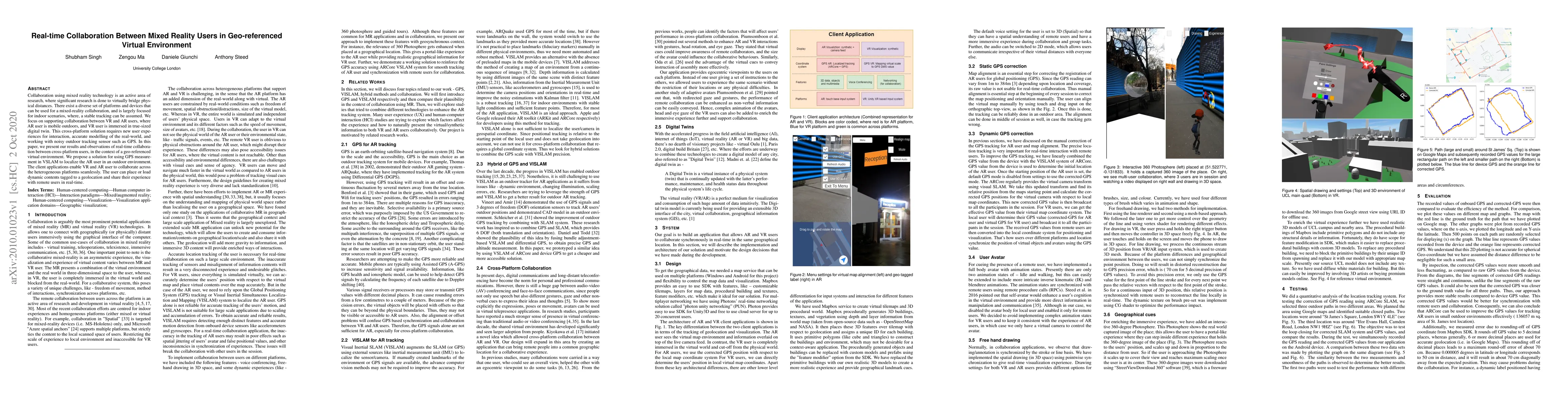 This paper explores real-time collaboration between VR and AR users in a geo-referenced virtual environment, proposing a solution that leverages GPS and VSLAM for outdoor AR user localization, enabling seamless interaction across heterogeneous platforms.