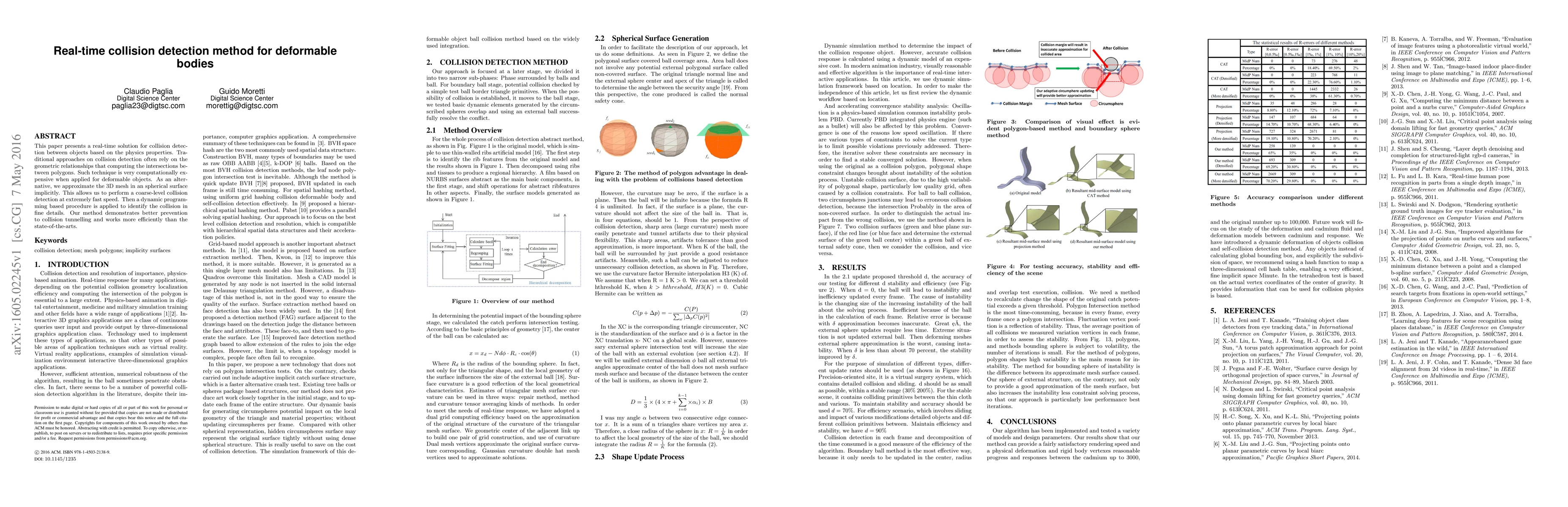 This paper proposes a real-time collision detection method for deformable bodies using an implicit spherical surface approximation and dynamic programming for fine-detail collision identification, achieving faster speeds and better collision prevention compared to traditional geometric methods.