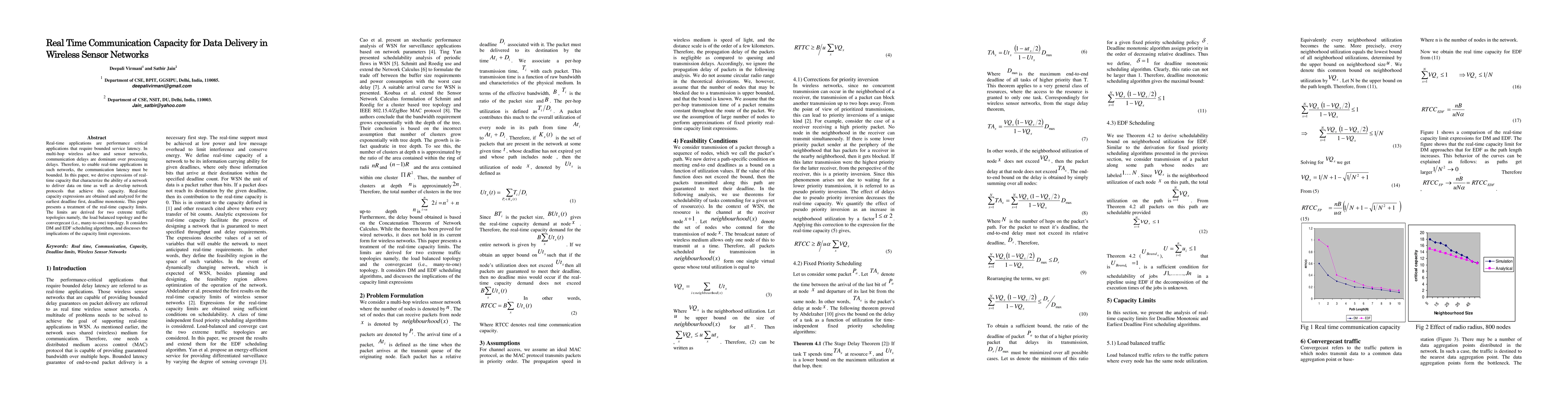 Real-time applications are performance critical applications that require bounded service latency. In multi-hop wireless ad-hoc and sensor networks, communication delays are dominant over processing delays. Therefore, to enable real-time applications in such networks, the communication latency must be bounded. In this paper, we derive expressions of real-time capacity that characterize the ability of a network to deliver data on time as well as develop network protocols that achieve this capacity. Real-time capacity expressions are obtained and analyzed for the earliest deadline first, deadline monotonic. This paper presents a treatment of the real-time capacity limits. The limits are derived for two extreme traffic topologies namely, the load balanced topology and the convergecast (i.e., many-to-one) topology. It considers DM and EDF scheduling algorithms, and discusses the implications of the capacity limit expressions.