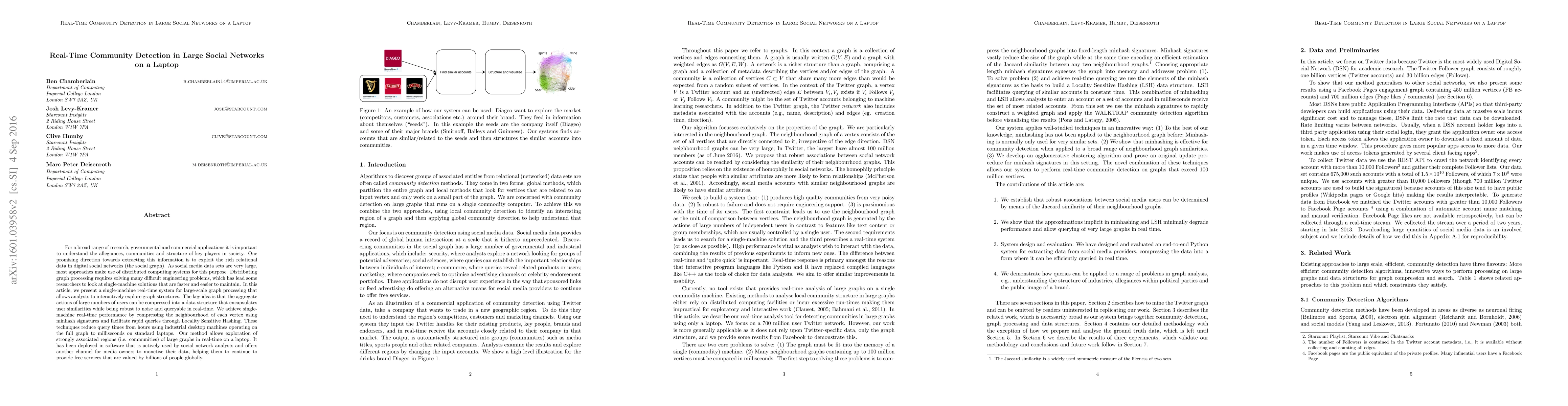 For a broad range of research, governmental and commercial applications it is important to understand the allegiances, communities and structure of key players in society. One promising direction towards extracting this information is to exploit the rich relational data in digital social networks (the social graph). As social media data sets are very large, most approaches make use of distributed computing systems for this purpose. Distributing graph processing requires solving many difficult engineering problems, which has lead some researchers to look at single-machine solutions that are faster and easier to maintain. In this article, we present a single-machine real-time system for large-scale graph processing that allows analysts to interactively explore graph structures. The key idea is that the aggregate actions of large numbers of users can be compressed into a data structure that encapsulates user similarities while being robust to noise and queryable in real-time. We achieve single machine real-time performance by compressing the neighbourhood of each vertex using minhash signatures and facilitate rapid queries through Locality Sensitive Hashing. These techniques reduce query times from hours using industrial desktop machines operating on the full graph to milliseconds on standard laptops. Our method allows exploration of strongly associated regions (i.e. communities) of large graphs in real-time on a laptop. It has been deployed in software that is actively used by social network analysts and offers another channel for media owners to monetise their data, helping them to continue to provide free services that are valued by billions of people globally.