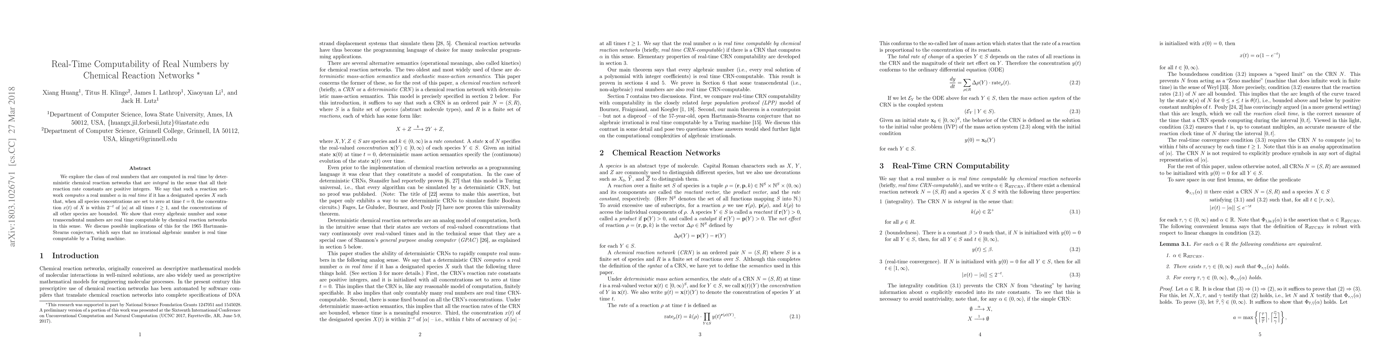 We explore the class of real numbers that are computed in real time by deterministic chemical reaction networks that are integral in the sense that all their reaction rate constants are positive integers. We say that such a reaction network computes a real number $\alpha$ in real time if it has a designated species $X$ such that, when all species concentrations are set to zero at time $t = 0$, the concentration $x(t)$ of $X$ is within $2^{-t}$ of $|{\alpha}|$ at all times $t \ge 1$, and the concentrations of all other species are bounded. We show that every algebraic number and some transcendental numbers are real time computable by chemical reaction networks in this sense. We discuss possible implications of this for the 1965 Hartmanis-Stearns conjecture, which says that no irrational algebraic number is real time computable by a Turing machine.