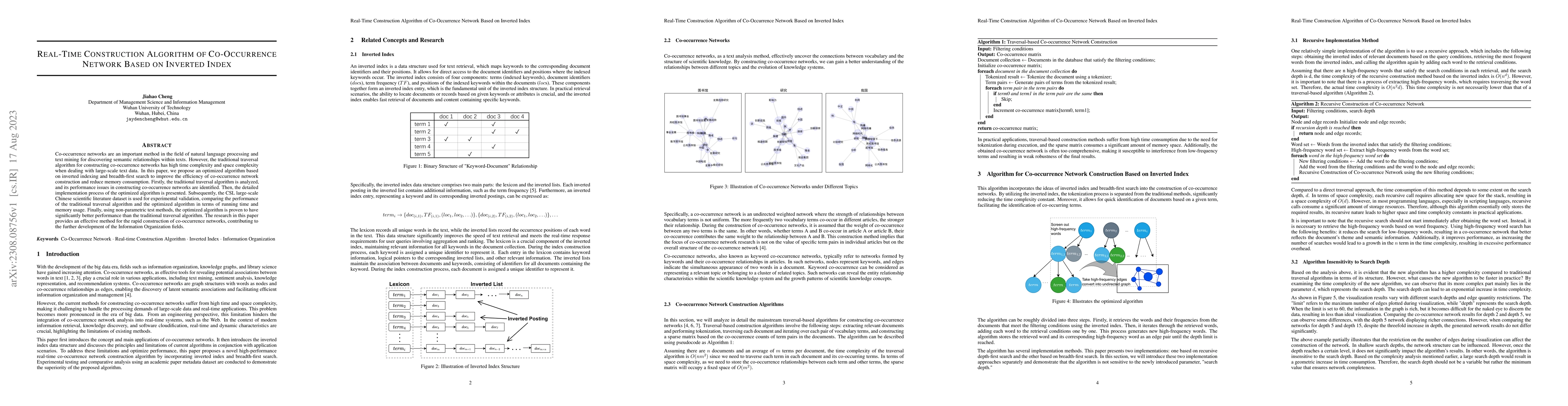 Co-occurrence networks are an important method in the field of natural language processing and text mining for discovering semantic relationships within texts. However, the traditional traversal algorithm for constructing co-occurrence networks has high time complexity and space complexity when dealing with large-scale text data. In this paper, we propose an optimized algorithm based on inverted indexing and breadth-first search to improve the efficiency of co-occurrence network construction and reduce memory consumption. Firstly, the traditional traversal algorithm is analyzed, and its performance issues in constructing co-occurrence networks are identified. Then, the detailed implementation process of the optimized algorithm is presented. Subsequently, the CSL large-scale Chinese scientific literature dataset is used for experimental validation, comparing the performance of the traditional traversal algorithm and the optimized algorithm in terms of running time and memory usage. Finally, using non-parametric test methods, the optimized algorithm is proven to have significantly better performance than the traditional traversal algorithm. The research in this paper provides an effective method for the rapid construction of co-occurrence networks, contributing to the further development of the Information Organization fields.