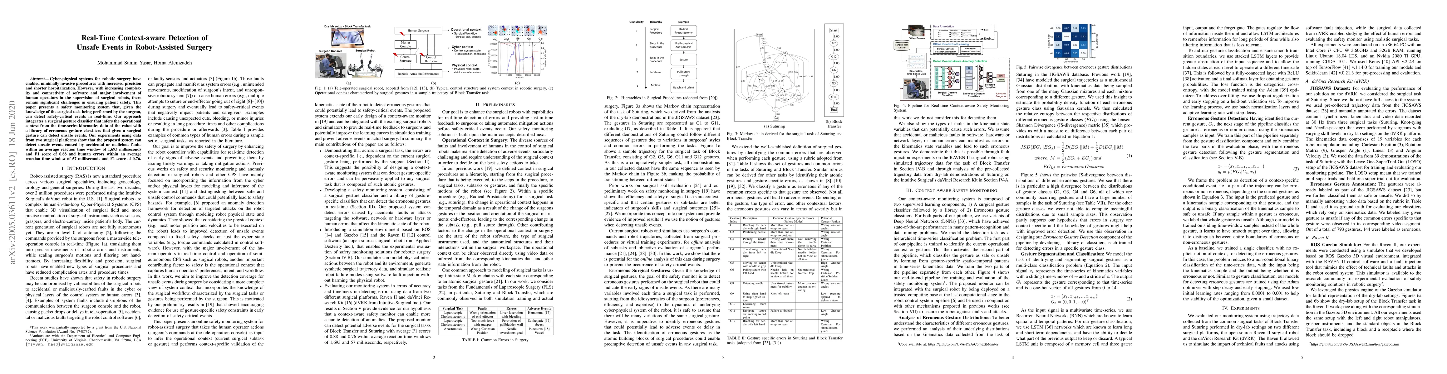 Cyber-physical systems for robotic surgery have enabled minimally invasive procedures with increased precision and shorter hospitalization. However, with increasing complexity and connectivity of software and major involvement of human operators in the supervision of surgical robots, there remain significant challenges in ensuring patient safety. This paper presents a safety monitoring system that, given the knowledge of the surgical task being performed by the surgeon, can detect safety-critical events in real-time. Our approach integrates a surgical gesture classifier that infers the operational context from the time-series kinematics data of the robot with a library of erroneous gesture classifiers that given a surgical gesture can detect unsafe events. Our experiments using data from two surgical platforms show that the proposed system can detect unsafe events caused by accidental or malicious faults within an average reaction time window of 1,693 milliseconds and F1 score of 0.88 and human errors within an average reaction time window of 57 milliseconds and F1 score of 0.76.