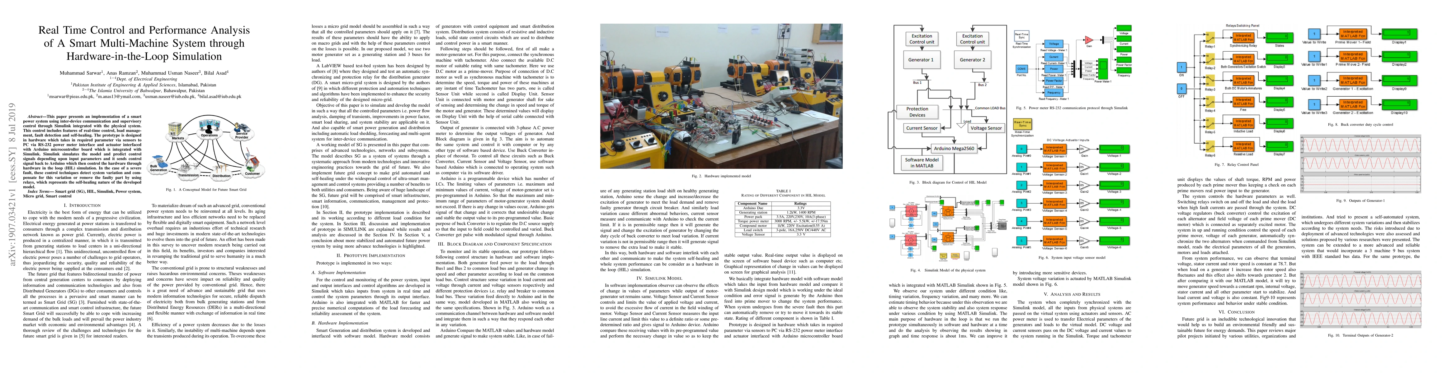 This paper implements a smart multi-machine power system using real-time control and fault detection via hardware-in-the-loop simulation with Simulink, featuring load management and self-healing capabilities through an integrated Arduino-based control system. The prototype demonstrates effective fault compensation and system recovery through relay-based isolation of faulty components.