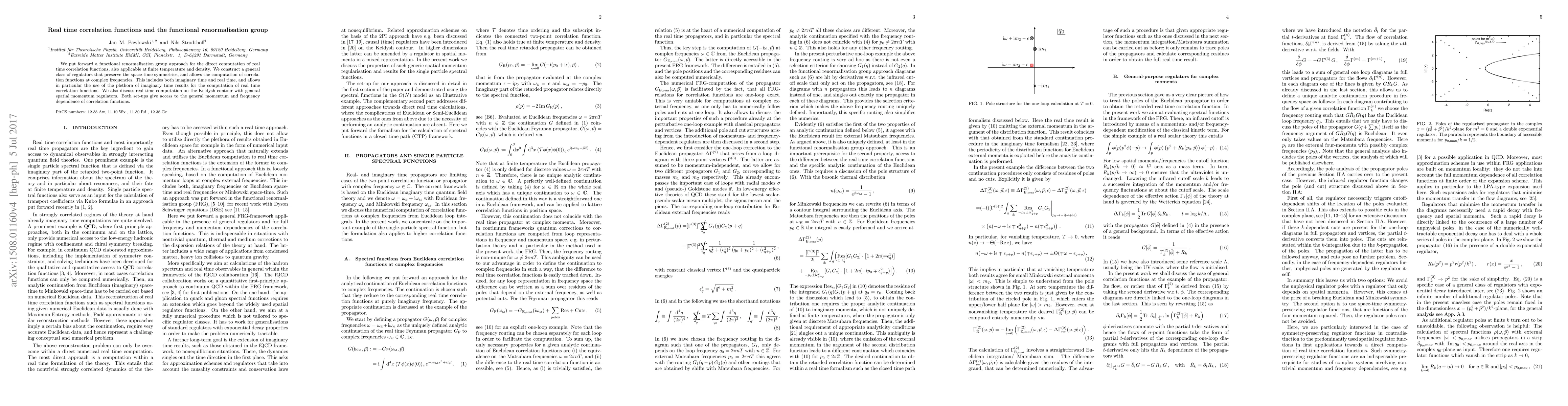 This paper proposes a functional renormalisation group approach for computing real time correlation functions, applicable at finite temperature and density, using a class of regulators that preserve space-time symmetries. It enables the computation of correlation functions at complex frequencies, leveraging imaginary time results for real time analysis.