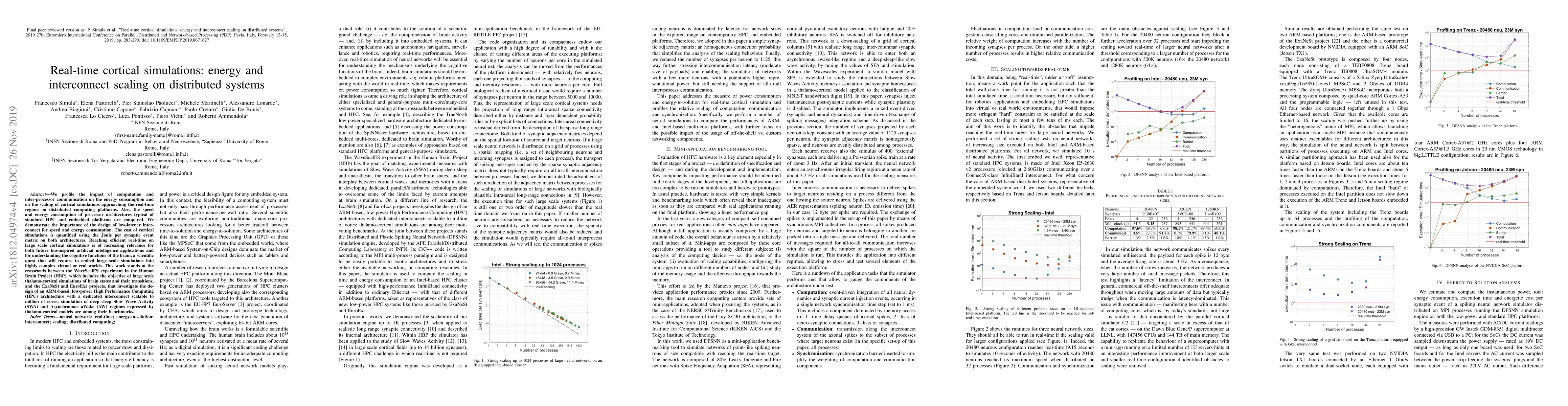 We profile the impact of computation and inter-processor communication on the energy consumption and on the scaling of cortical simulations approaching the real-time regime on distributed computing platforms. Also, the speed and energy consumption of processor architectures typical of standard HPC and embedded platforms are compared. We demonstrate the importance of the design of low-latency interconnect for speed and energy consumption. The cost of cortical simulations is quantified using the Joule per synaptic event metric on both architectures. Reaching efficient real-time on large scale cortical simulations is of increasing relevance for both future bio-inspired artificial intelligence applications and for understanding the cognitive functions of the brain, a scientific quest that will require to embed large scale simulations into highly complex virtual or real worlds. This work stands at the crossroads between the WaveScalES experiment in the Human Brain Project (HBP), which includes the objective of large scale thalamo-cortical simulations of brain states and their transitions, and the ExaNeSt and EuroExa projects, that investigate the design of an ARM-based, low-power High Performance Computing (HPC) architecture with a dedicated interconnect scalable to million of cores; simulation of deep sleep Slow Wave Activity (SWA) and Asynchronous aWake (AW) regimes expressed by thalamo-cortical models are among their benchmarks.