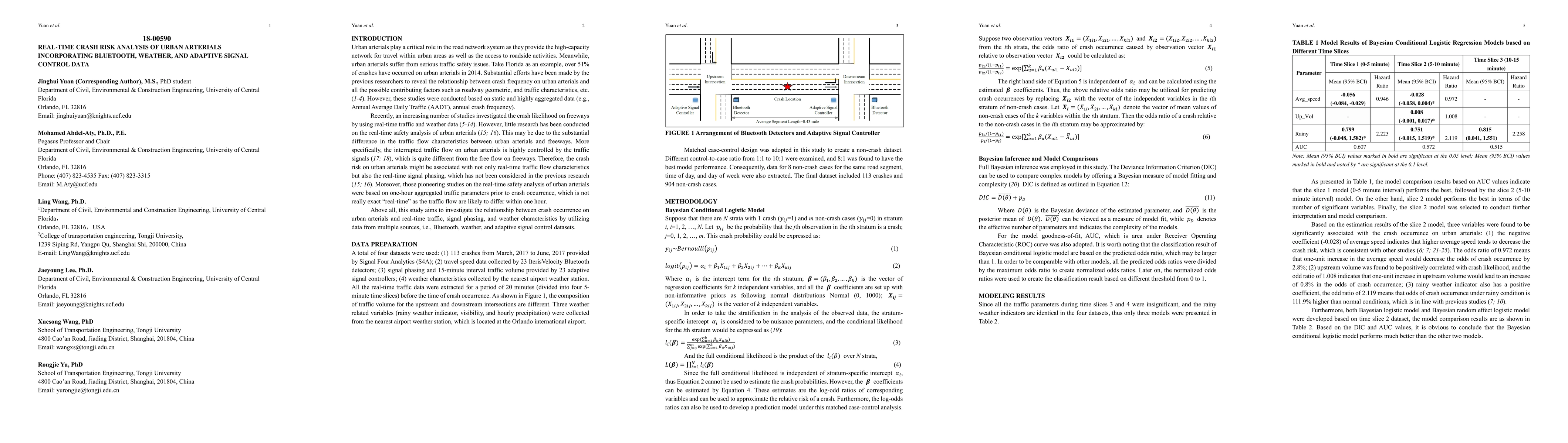 This study develops Bayesian conditional logistic models to assess real-time crash risk on urban arterials using Bluetooth, weather, and adaptive signal control data. The results show that average speed, upstream volume, and rainy weather significantly affect crash occurrence, with the 5-10 minute interval model providing the most accurate predictions.