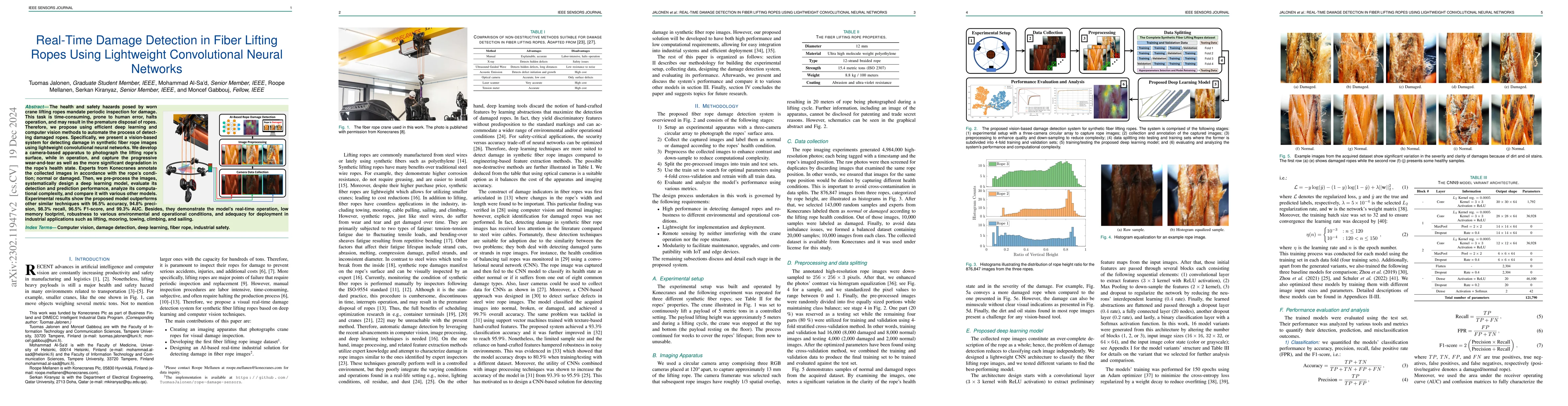 This paper proposes a convolutional neural network (CNN)-based system for real-time damage detection in fiber lifting ropes using computer vision. The model achieves high accuracy (96.4%) and precision (95.8%) in detecting damaged rope images, demonstrating its potential for industrial deployment.