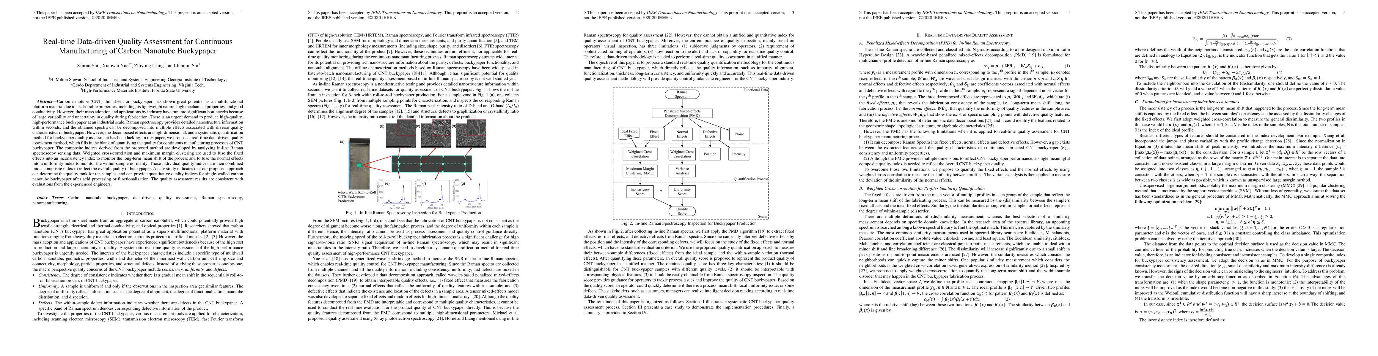 Carbon nanotube (CNT) thin sheet, or buckypaper, has shown great potential as a multifunctional platform material due to its desirable properties, including its lightweight nature, high mechanical properties, and good conductivity. However, their mass adoption and applications by industry have run into significant bottlenecks because of large variability and uncertainty in quality during fabrication. There is an urgent demand to produce high-quality, high-performance buckypaper at an industrial scale. Raman spectroscopy provides detailed nanostructure information within seconds, and the obtained spectra can be decomposed into multiple effects associated with diverse quality characteristics of buckypaper. However, the decomposed effects are high-dimensional, and a systematic quantification method for buckypaper quality assessment has been lacking. In this paper, we propose a real-time data-driven quality assessment method, which fills in the blank of quantifying the quality for continuous manufacturing processes of CNT buckypaper. The composite indices derived from the proposed method are developed by analyzing in-line Raman spectroscopy sensing data. Weighted cross-correlation and maximum margin clustering are used to fuse the fixed effects into an inconsistency index to monitor the long-term mean shift of the process and to fuse the normal effects into a uniformity index to monitor the within-sample normality. Those individual quality indices are then combined into a composite index to reflect the overall quality of buckypaper. A case study indicates that our proposed approach can determine the quality rank for ten samples, and can provide quantitative quality indices for single-walled carbon nanotube buckypaper after acid processing or functionalization. The quality assessment results are consistent with evaluations from the experienced engineers.