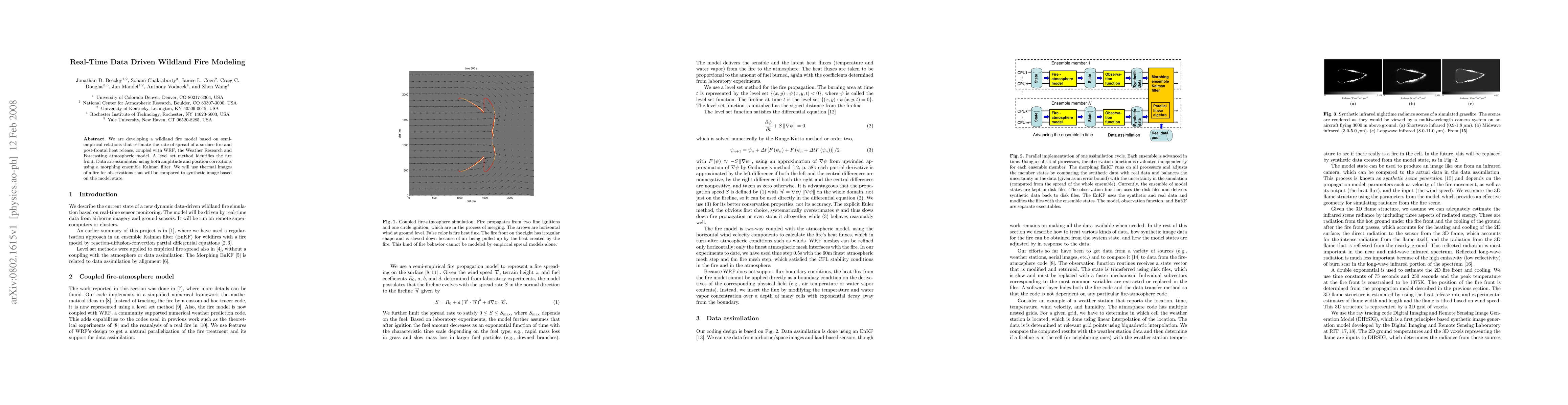 This paper develops a real-time wildland fire model using semi-empirical relations and WRF atmospheric modeling, incorporating a level set method for fire front identification and an ensemble Kalman filter for data assimilation. Thermal images will validate the model against synthetic fire imagery.