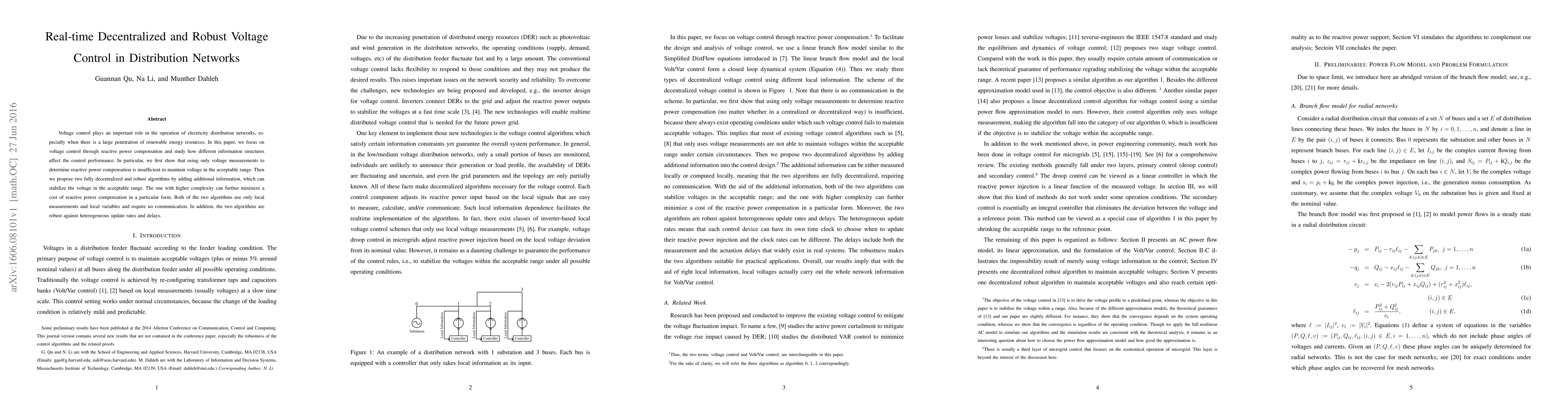 This paper proposes two decentralized and robust algorithms for real-time voltage control in distribution networks with high renewable energy penetration. It finds that voltage measurements alone are insufficient for effective control and introduces algorithms that use additional local information to stabilize voltage, with one minimizing compensation costs.