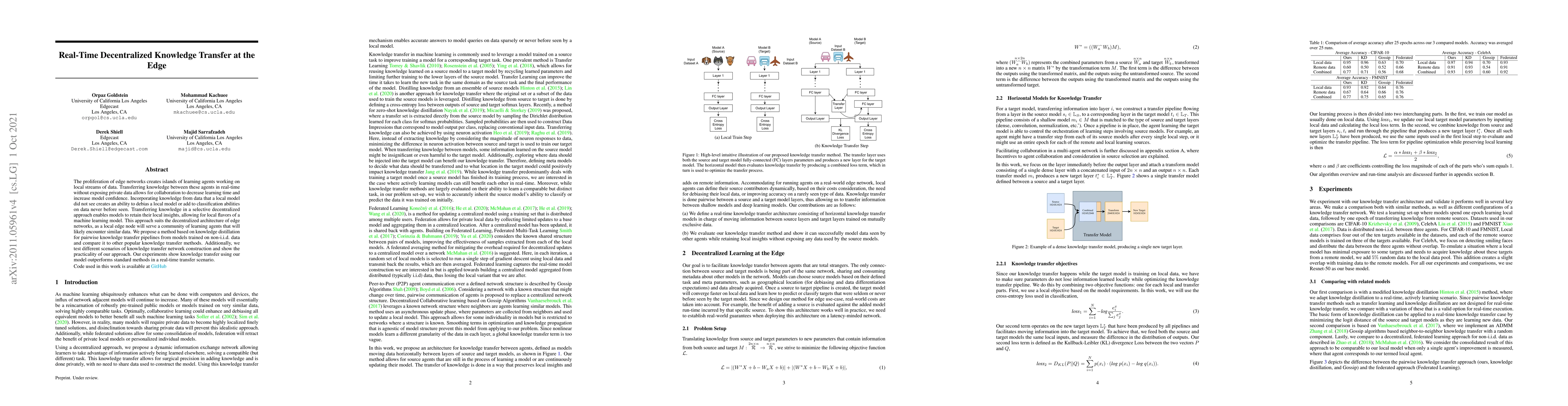This paper proposes a real-time decentralized knowledge transfer method that enables edge networks to collaborate without exposing private data, improving learning time and model confidence. The proposed approach outperforms standard methods in a real-time transfer scenario, showcasing its practicality in edge networks.