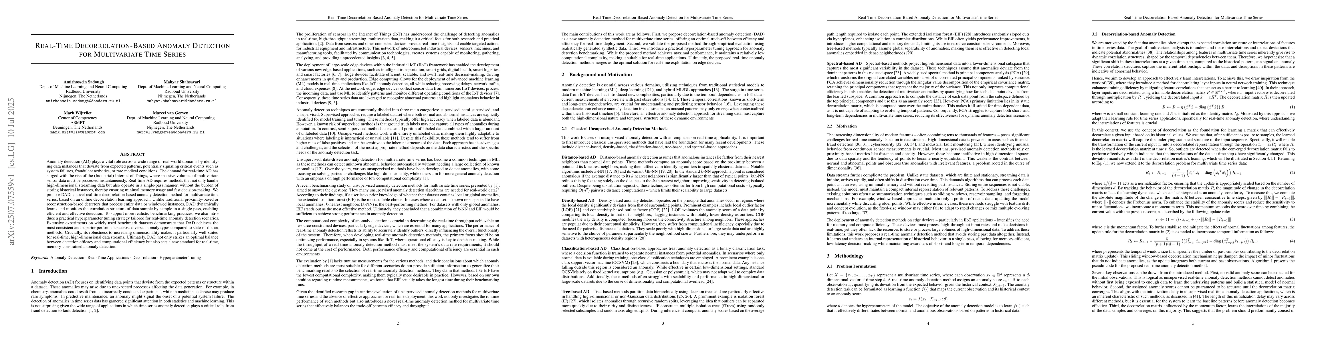 Anomaly detection (AD) plays a vital role across a wide range of real-world domains by identifying data instances that deviate from expected patterns, potentially signaling critical events such as system failures, fraudulent activities, or rare medical conditions. The demand for real-time AD has surged with the rise of the (Industrial) Internet of Things, where massive volumes of multivariate sensor data must be processed instantaneously. Real-time AD requires methods that not only handle high-dimensional streaming data but also operate in a single-pass manner, without the burden of storing historical instances, thereby ensuring minimal memory usage and fast decision-making. We propose DAD, a novel real-time decorrelation-based anomaly detection method for multivariate time series, based on an online decorrelation learning approach. Unlike traditional proximity-based or reconstruction-based detectors that process entire data or windowed instances, DAD dynamically learns and monitors the correlation structure of data sample by sample in a single pass, enabling efficient and effective detection. To support more realistic benchmarking practices, we also introduce a practical hyperparameter tuning strategy tailored for real-time anomaly detection scenarios. Extensive experiments on widely used benchmark datasets demonstrate that DAD achieves the most consistent and superior performance across diverse anomaly types compared to state-of-the-art methods. Crucially, its robustness to increasing dimensionality makes it particularly well-suited for real-time, high-dimensional data streams. Ultimately, DAD not only strikes an optimal balance between detection efficacy and computational efficiency but also sets a new standard for real-time, memory-constrained anomaly detection.