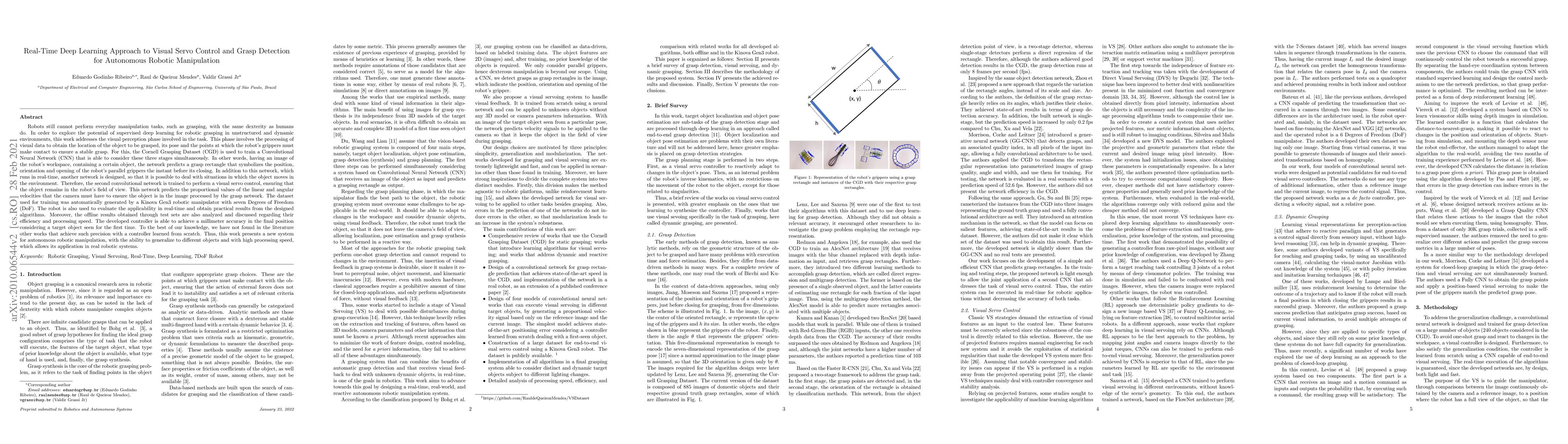 This paper presents a real-time deep learning approach for visual servo control and grasp detection in autonomous robotic manipulation. It utilizes convolutional neural networks trained on the Cornell Grasping dataset to predict grasp rectangles and control object tracking in dynamic environments, achieving millimeter accuracy and high processing speed.