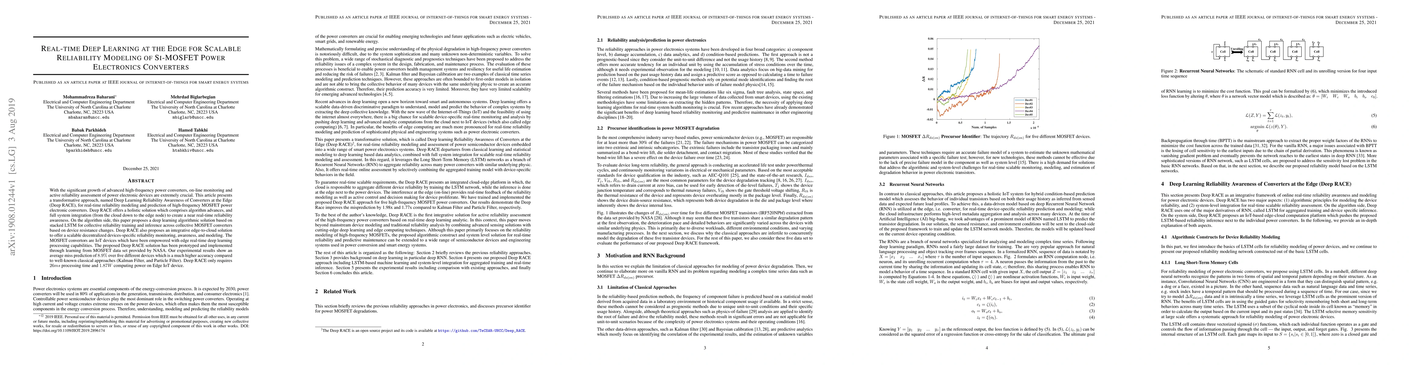 This paper introduces Deep Learning Reliability Awareness of Converters at the Edge (Deep RACE), a real-time deep learning approach for predicting the reliability of high-frequency MOSFET power converters. The proposed method uses stacked LSTM for real-time reliability modeling and achieves higher accuracy compared to classical methods, with an average miss prediction of 8.9%.