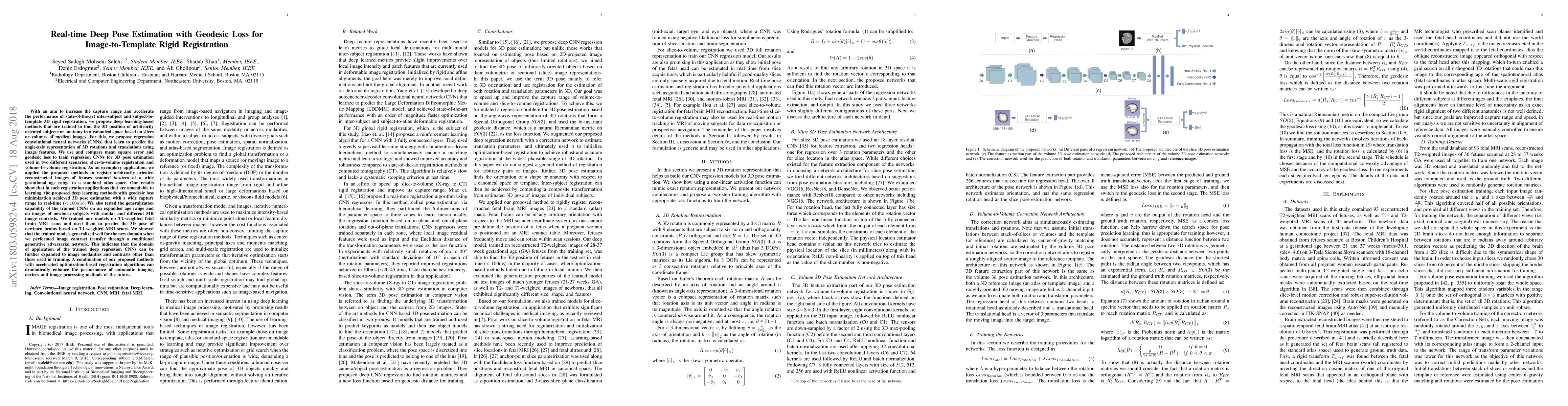 This paper proposes deep learning methods for real-time 3D pose estimation in medical image registration, using geodesic loss to achieve wide capture range and high accuracy. The trained CNNs generalize well across different age groups and image contrasts, indicating potential for broader application in medical imaging.